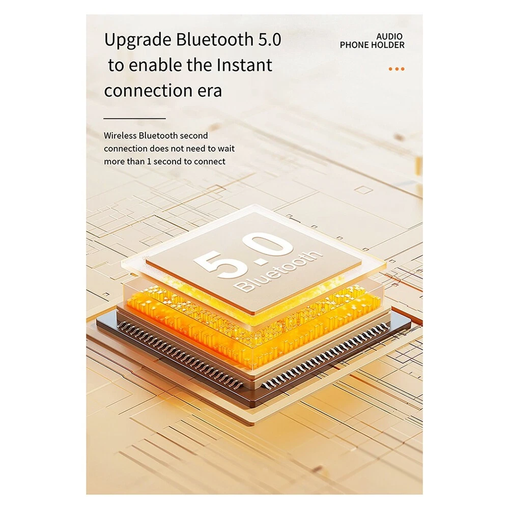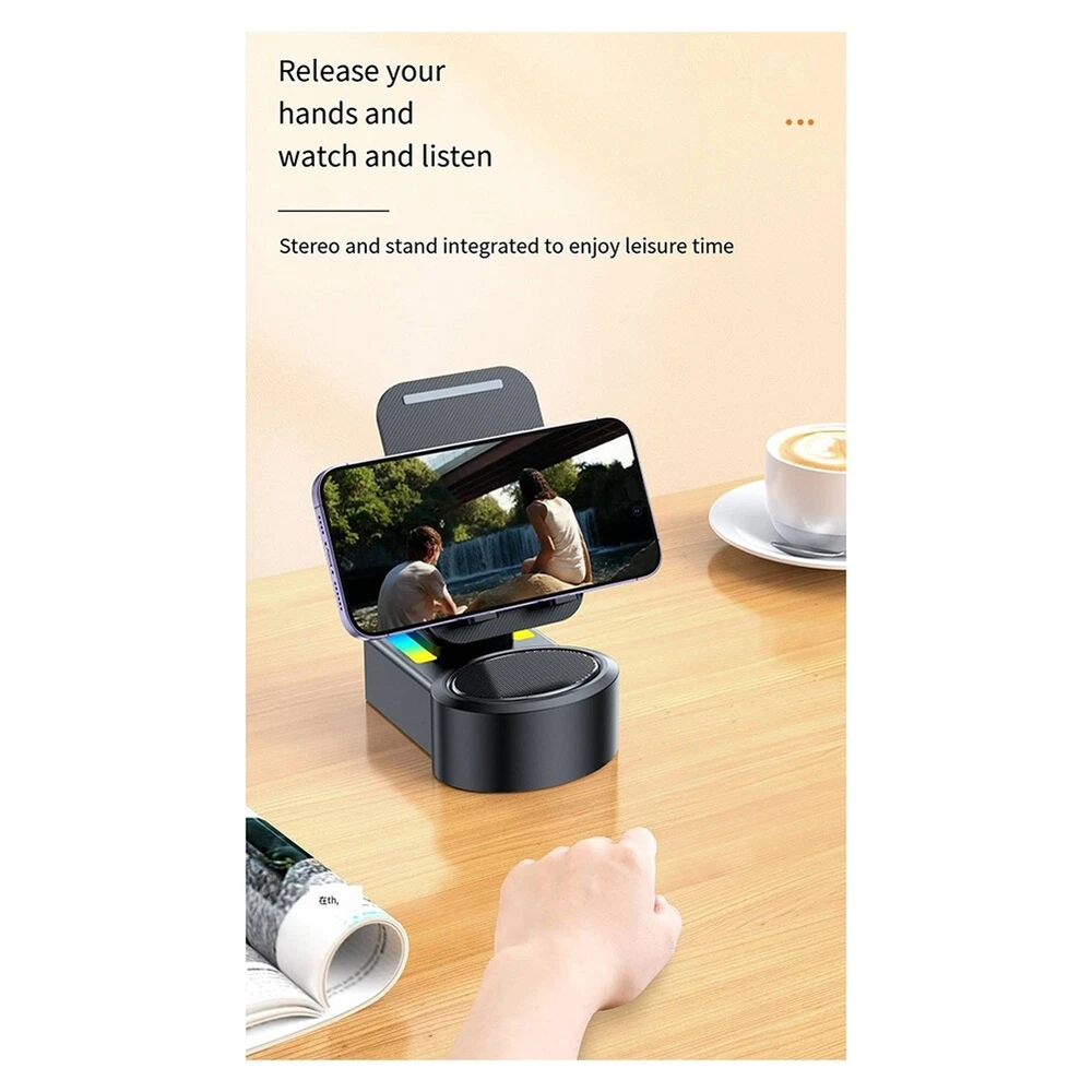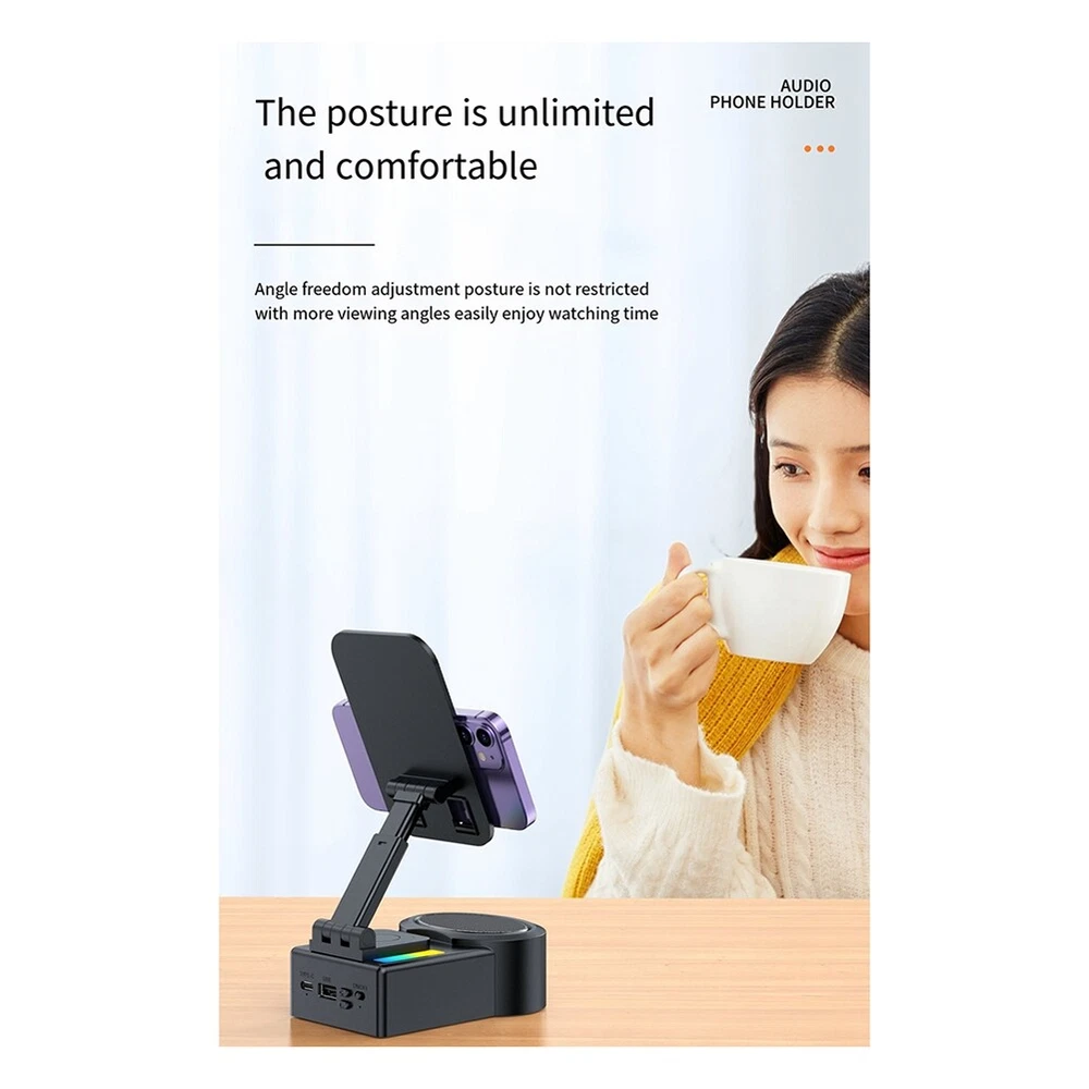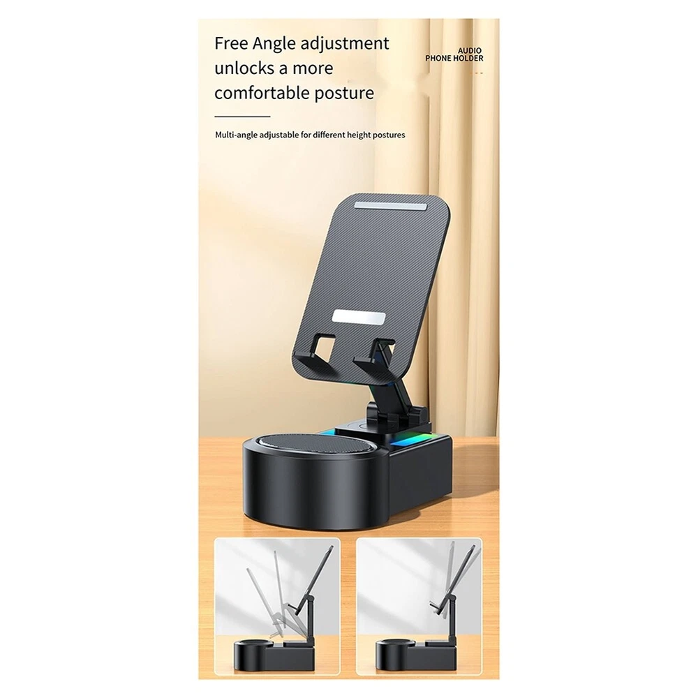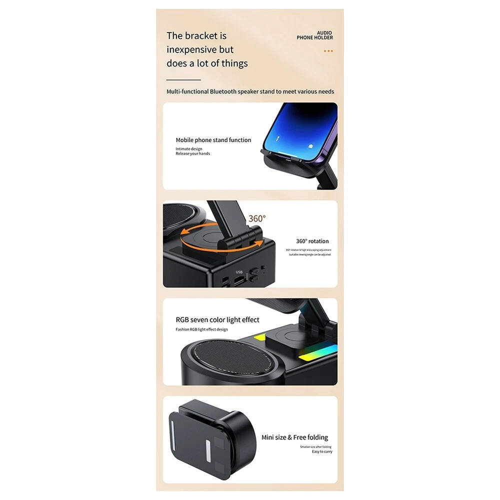 Phone Stand Speaker Cradle Adjustable for Office Foldable Cellphone Stand7992 [Multi Functions]: Phone stand with wireless speaker, and support charging for phones, 2000mA large capacity rechargeable, play to 8 hours. [Adjustable Angle]: Liftable and rotatable phone cradle, the angle and the height of the phone holder are adjustable to meet your needs for a better view angle. [RGB Light Effect]: The phone bracket has 360° RGB colorful ambience light effect, changes with the rhythm of music. [Portable Size]: The foldable phone stand for desk is small and , easy to carry in your pocket or bag, and suitable for home, office, travel or business trips. [Nice Gifts]: Universal desktop tablet and phone holder, suitable for most tablet and smartphones, it is a nice gift for your friends and family. version: 5.0 Battery capacity: 2000mAh Play time: about 8h Colour:Black Material:plastic Package Contents: 1 x Rechargeable mobile phone holder