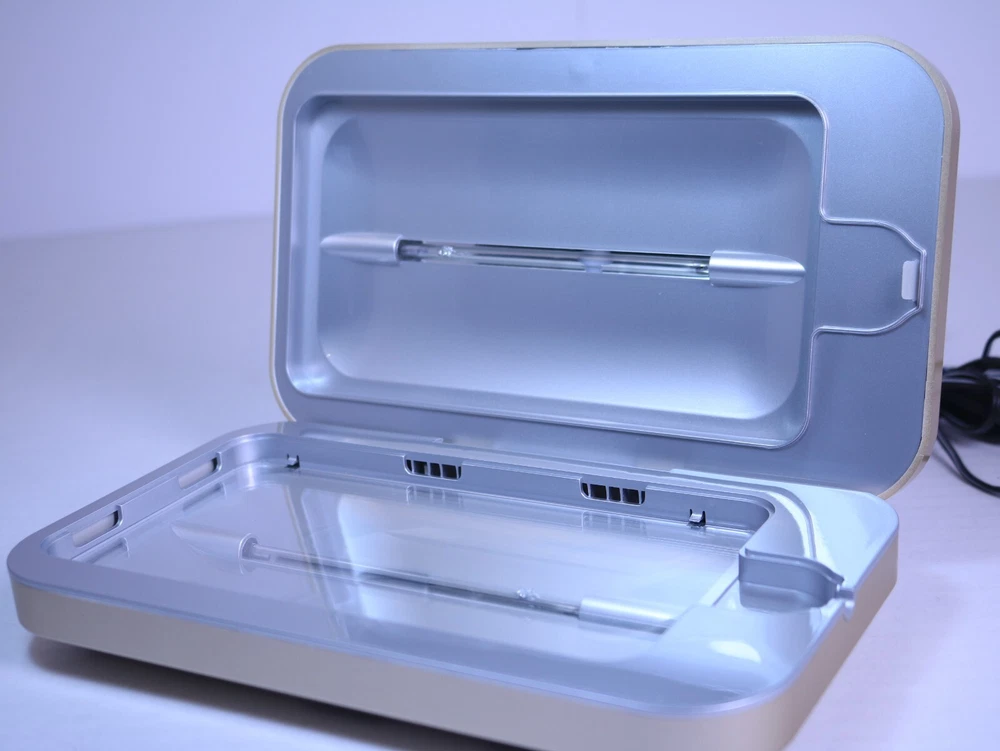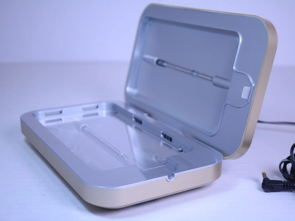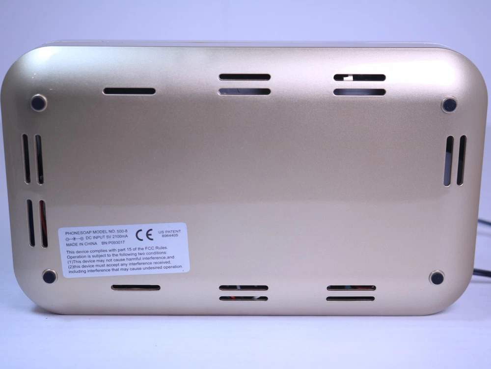 "PhoneSoap 500-8 2.0 UV Sanitizer and Charger - Gold Color, Tested, With AC Charger, Good Conditions": **Title:** PhoneSoap 500-8 2.0 UV Sanitizer and Charger - Gold Color, Tested, With AC Charger, Good Conditions **Description:** For sale is a PhoneSoap 500-8 2.0 UV Sanitizer and Charger in an elegant gold color. This device has been thoroughly tested and is in good working conditions. It includes the AC charger for your convenience. Please review the images and feel free to ask any questions before making a purchase. **Specifications:** - Brand: PhoneSoap - Model: 500-8 2.0 - Type: UV Sanitizer and Charger - Color: Gold - Condition: Tested, good conditions - Included: PhoneSoap 500-8 2.0 UV Sanitizer, AC Charger - Compatibility: Fits most smartphones and other small items **Who Should Buy It:** - Hygiene Enthusiasts: Ideal for individuals concerned about cleanliness and sanitization of personal devices. - Tech Enthusiasts: Perfect for those who want a tech-savvy way to keep their devices clean and charged. - Anyone Seeking Cleanliness: A great addition to any household, especially in times of heightened hygiene awareness. **Why You Should Buy It:** - Tested and Functional: The PhoneSoap 500-8 2.0 UV Sanitizer and Charger is tested and working well. - Elegant Design: Features an attractive gold color, complementing various interior aesthetics. - Convenient Charging: Acts as both a sanitizer and a charging station for your devices. **Detailed Conditions:** - The PhoneSoap 500-8 2.0 UV Sanitizer and Charger is in good conditions and has been thoroughly tested. - Please review the images to assess the device's overall condition and features. - The item is sold as-is, and no returns will be accepted. If you have any questions or need more information, please feel free to ask before making your purchase. Keep your phone clean and charged with PhoneSoap 500-8 2.0 UV Sanitizer and Charger. This product from PhoneSoap comes in a stylish gold color and is made of durable plastic material. With its UV sanitization feature, it effectively eliminates germs and bacteria on your phone. Aside from its sanitizing feature, this Phone Soap product also functions as a charger for your mobile phone. It comes with an AC charger that is tested and guaranteed to work seamlessly with the device. Get this PhoneSoap 500-8 2.0 UV Sanitizer and Charger now and keep your phone clean and fully charged at all times!