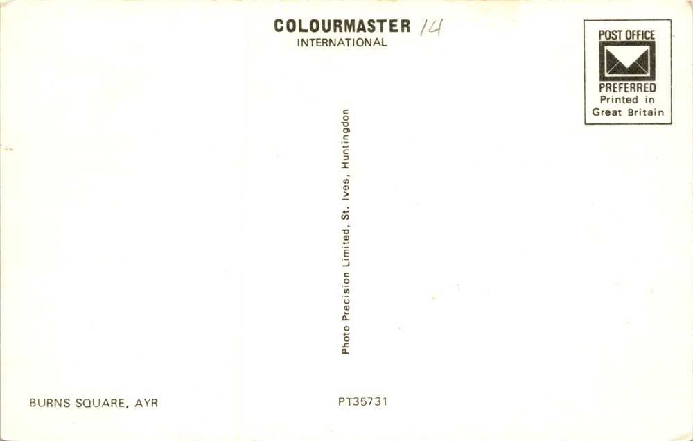 MAKE AN OFFER. THE MORE YOU BUY THE BETTER DEAL I WILL ACCEPT The postcard features an image of the Burns Square in Ayr, Scotland. The photo was taken by Photo Precision Limited in St. Ives, Huntingdon, and printed in Great Britain by Colourmaster International. The postcard was likely produced in the 1960s or 1970s, given the reference to Be Colourmaster 14.