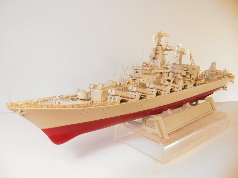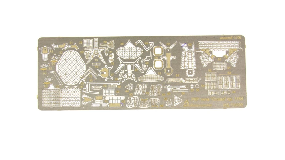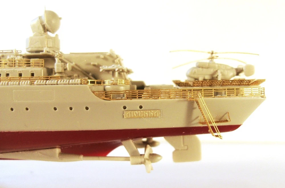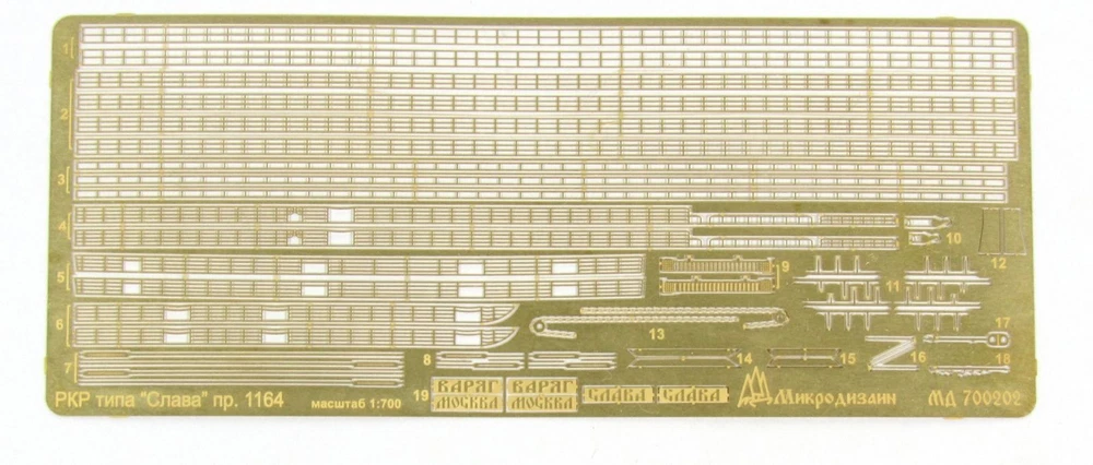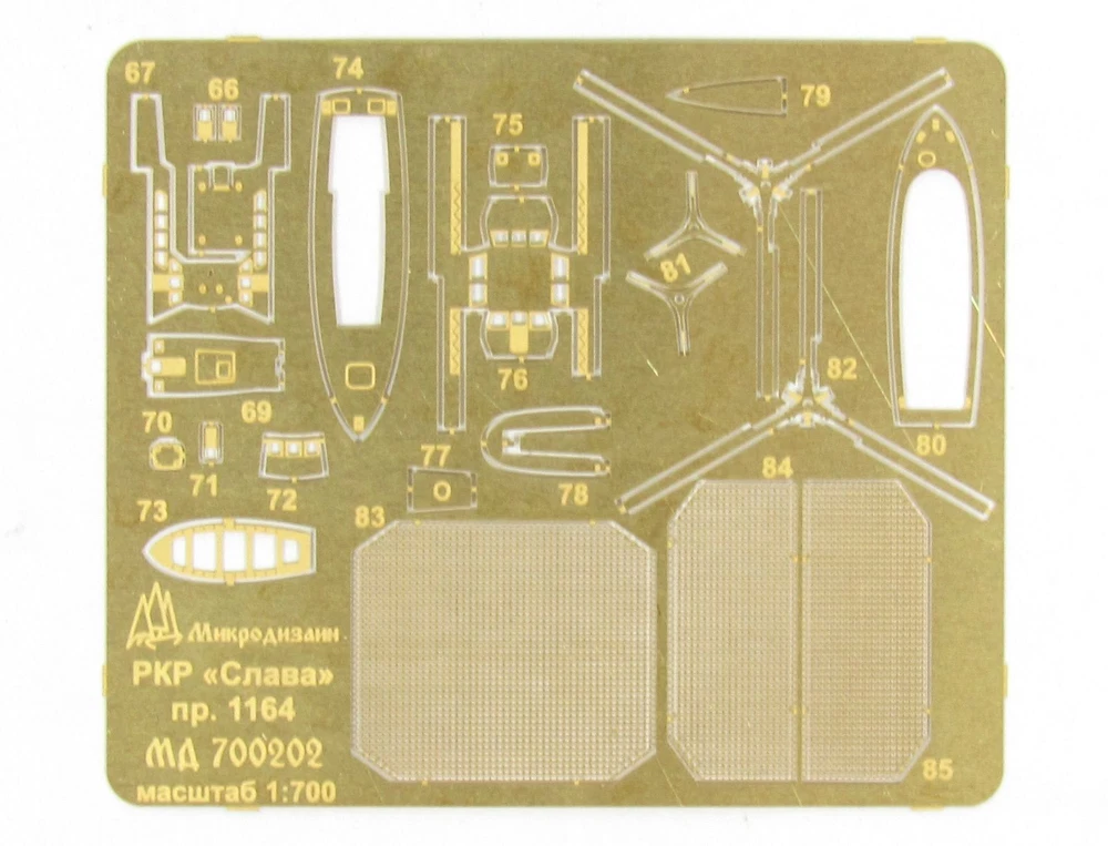Enhance the accuracy and realism of your Russian Navy class Missile cruiser model "Moscow" with this photo-etched detailing set from Trumpeter. Expertly designed to add intricate details, this set promises a more authentic and professional finish. Elevate your modeling game with this set and impress fellow enthusiasts. MD700202 Photo etching kit for Russian Navy class Missile cruiser " Moscow " from Trumpeter ( 05720 , 05721 , 05722 ) . The scale is 1 : 700 . Material : brass 0.12 mm , nickel silver 0.12 mm . The set is equipped with 3 photo etching plates and a color photo instruction .