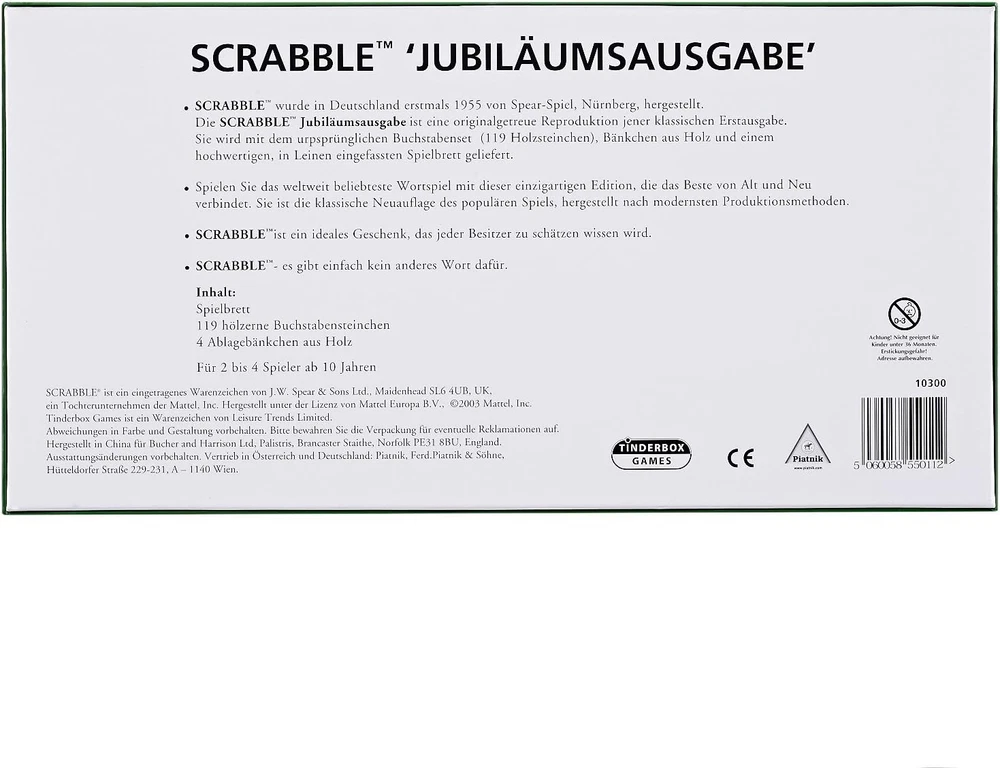 Further Details Title: Piatnik 5501 "Scrabble - Anniversary Edition" German Version 1 Board Gam Single Condition: New Release Date: 08/07/2012 Type: Board Games Age Level: 10 Jahre to 99 Jahre Brand: Piatnik Color: Multicolor Material: Cardboard Theme: Number Language: English, Italian, French, German, Spanish Age Level: 10 - 18 years Min. Number of Players: 2-4 Genre: Puzzle Item Length: 370mm Item Width: 190mm Item Height: 35mm MPN: 55011 Description: DESCRIPCIÓN DEL PRODUCTO DESCRIPCIÓN DEL PRODUCTO Hecho con materiales de alta calidad, tiene una fuerte resistencia al impacto y una fuerte consistencia, lo que aumenta efectivamente el coeficiente de resistencia a la colisión. ADVERTENCIA DE SEGURIDAD No apto para niños menores de la edad de 3 Item Weight: 680g Number of players: 2-4 Playtime: 60 Minutes Recommended age: 10 years and up Number of players: 2-4 Playtime: 60 Minutes Recommended age: 10 years and up Missing Information? Please contact us if any details are missing and where possible we will add the information to our listing.