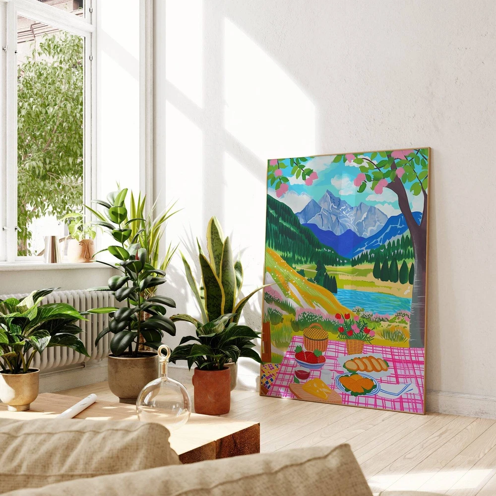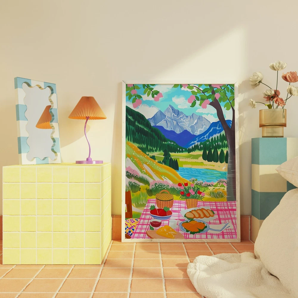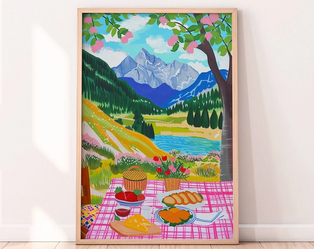 Picnic In The Mountain Food Illustration Colorful Scenery Wall Art Material: Premium luster photo paper Print type: Inkjet printing One side printed + The finish provides the highest possible resolution and color saturation + Lasts up to 200 years in color and 400 years in black-and-white + Printed on high-quality resin-coated photo base paper medium + Posters can be hung with double-sided tape, tacks, or framed + Hand washing with a gentle cry cloth is recommended for extended durability I will hand select the best choice of paper for your chosen design to ensure top quality results for a beautiful, bright and luxurious print. All prints are sealed in cellophane slips for protection during transportation, and are shipped in a protective cardboard envelope.