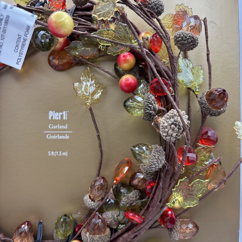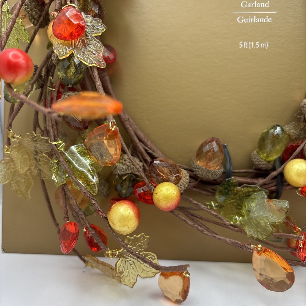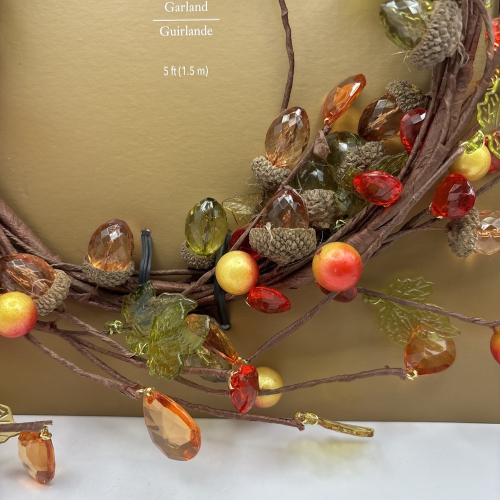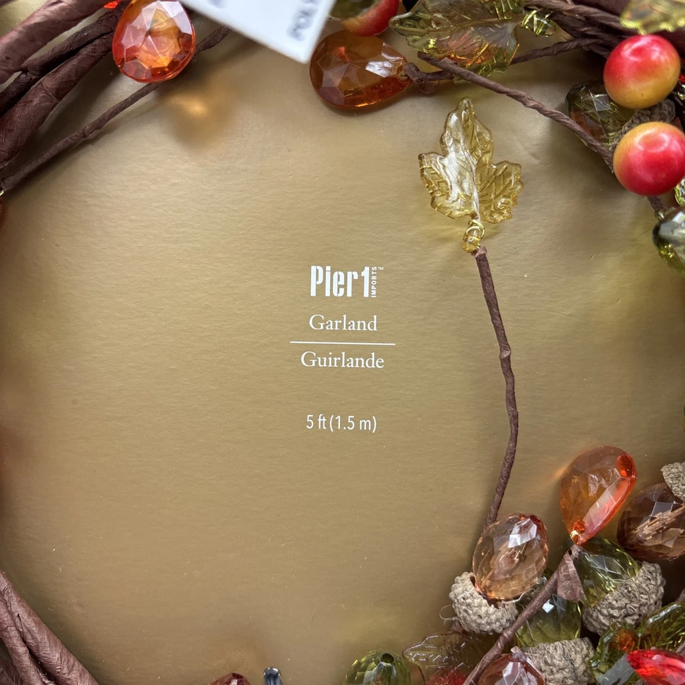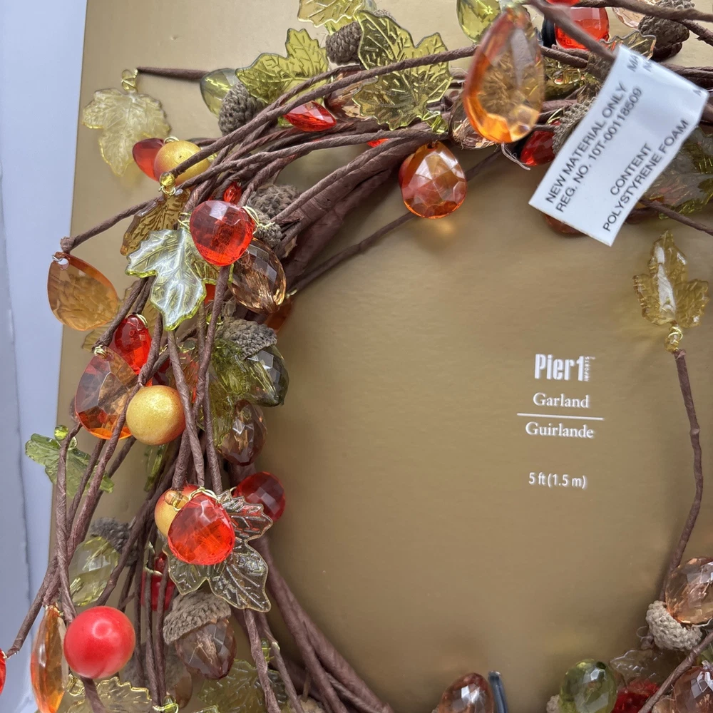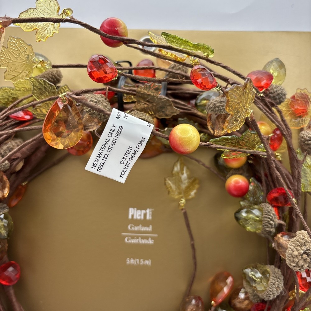 This is a Pier 1 fall garland featuring acorns, berries and leaves in plastic and other man made materials. This garland measures 5 feet long when opened up. Item is attached to its original packaging. A pretty piece in excellent vintage condition.