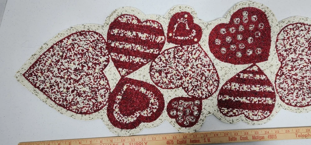 Pier on Valentin heart beaded table runner. 13 inches by 36 inches, New without tags. One owner and I never used it. all beads present. excellent condition Please scan, enlarge and review all photos closely for they are a large part of the description. Photos are of the actual item offered for sale. Communication: Please contact me if you have any questions prior to purchase. I will email you as soon as your item is shipped. Payment : please pay immediately. Items are not kept on hold for extended periods. Shipping and handling: I will ship your order within one business day whenever possible. Please verify your address during checkout. I am not responsible for any wrong or undeliverable addresses. Combined Shipping is offered. I offer free returns within 30 days , if item doesn't match the description. Returns must be initiated within 7 days after delivery. Item must come back in the same condition and like packaging as it was sent to you for a refund. Please check out my other items.