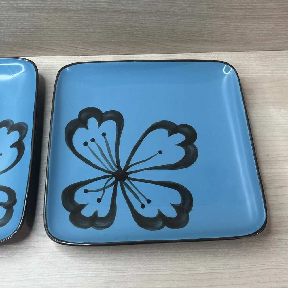 Pier 1 Hibiscus Pattern Brown Turquois Square Salads Plates 9" Set of 2
