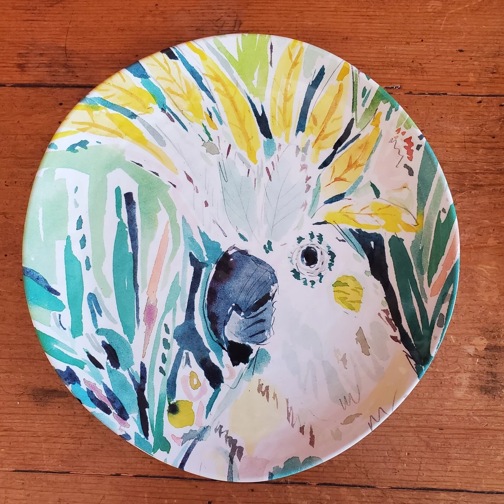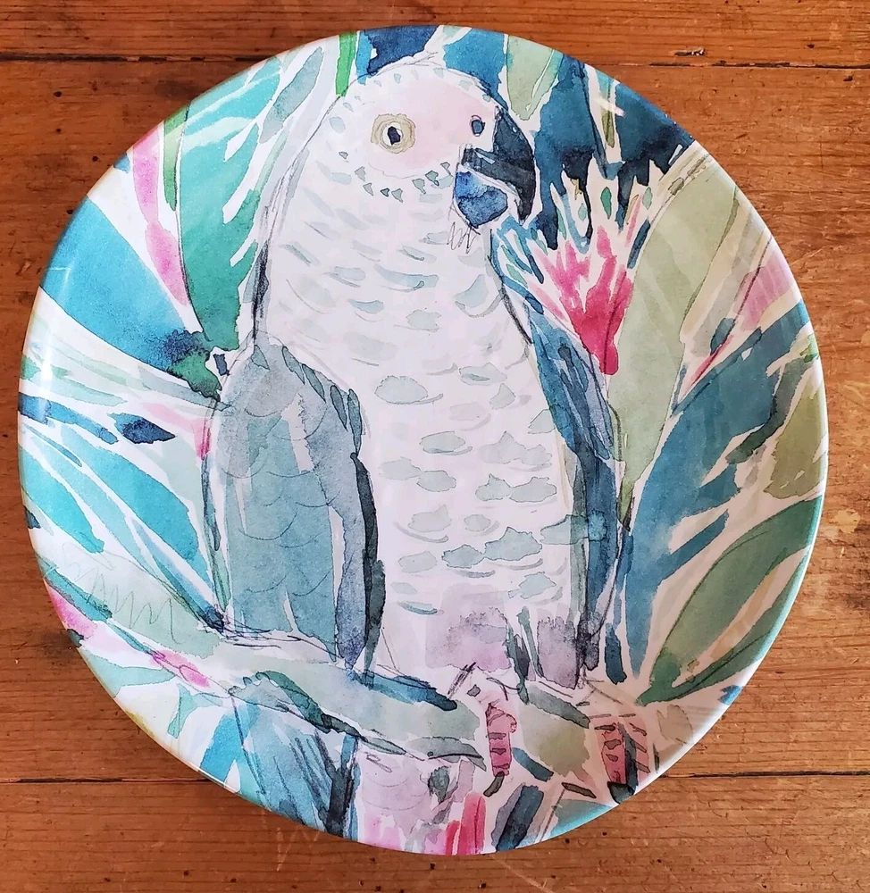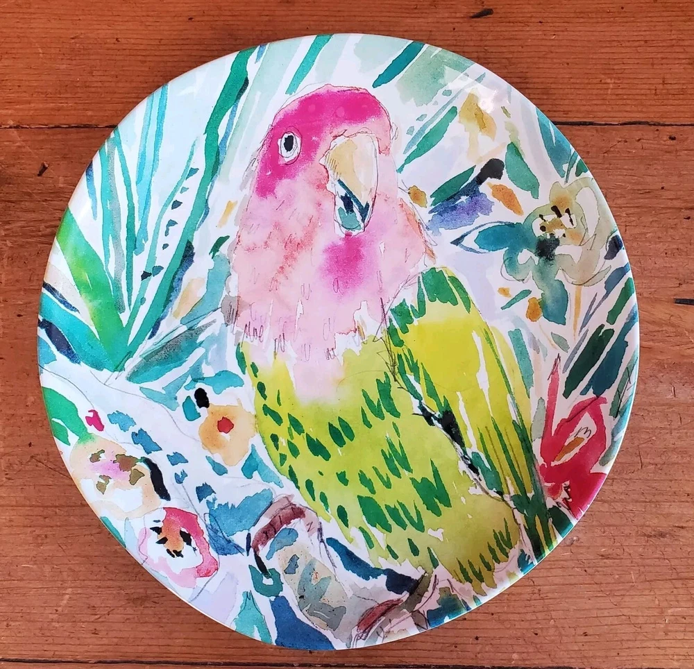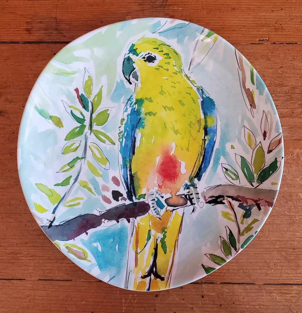 Pier 1 Melamine Colorful Birds Parrots Cockatoo Tropical Plates 8.75” Set Of 4 Lot of 4 beautifully decorated Pier 1 Imports melamine parrot plates For many fun gatherings/events In new condition Thanks for Looking Lot 49