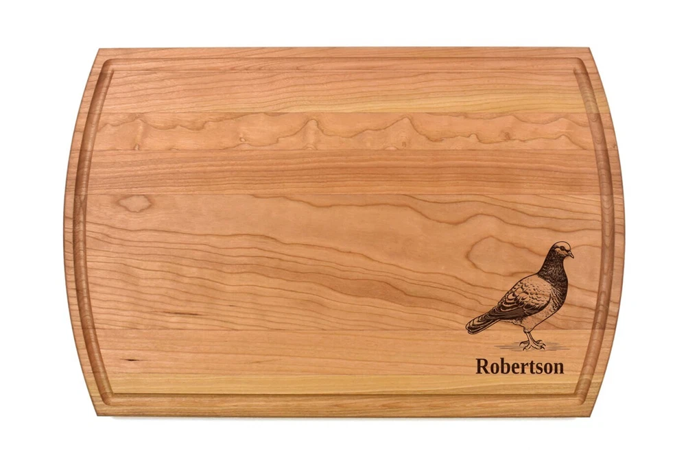 Design: Personalized Pigeon Cutting Board or Charcuterie Serving Tray All items ship via USPS - please make sure your address is correct :-) Whether used as a charcuterie serving tray for snacks or cutting board, our bamboo, walnut and cherry custom boards are the perfect addition for the home and make the perfect gift for your loved one celebrating a birthday, anniversary, new home, wedding, etc! *** FEATURES *** • SIZES: We have multiple styles and sizes available. To see our current sizes available, click the drop-down menu. The photo slide contains a photo showing each side by side. Please note, the board with the juice groove only has the groove on the front side of the board. • THICKNESS: Bamboo Boards - Approximately 1/2" Thick; Walnut & Cherry Boards - Approximately 3/4” Thick • UNIQUE: Every board is unique with the grain and coloring varying throughout - no board is the same! • CARE INSTRUCTIONS: Hand wash only with warm water. Do not soak. Please apply mineral oil throughout the board’s life. • PERSONALIZATION/CUSTIMIZATION: Do you want the text placed differently on the board? Please don’t hesitate to contact us. All personalization notes can be entered in the personalization box when checking out. • SHIPPING: All cutting boards ship within 2 to 5 business days. • WHOLESALE ORDERS: Please don’t hesitate to contact us for information about wholesale orders. Processing times for larger orders may change. • NOTE: Colors can vary a bit on different monitors and screens. Any props included in photos are not included. Please be sure to double-check your address to make sure it is accurate for USPS delivery. If a package is returned to us due to an invalid address, the buyer is responsible for all additional shipping charges. We appreciate you supporting small business – best wishes! For items ordered with simple edits, we do not send proofs since the layout doesn't change from the example(s). However, in the event there are requests that change the layout from the example(s), we do send proofs for approval before making the product. If you'd like a proof before we make the product, please note so in the personalization box.