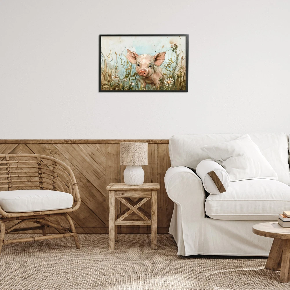 Add dimension to any room with our textured Framed Giclee Artwork. Our framed artwork is securely mounted into a 1.5-inch thick wood grain frame and ready to hang. Frames are available in three alluring styles: black, gray farmhouse and white. In addition, you should check out our oversized options if you want a statement piece. Wall Art is made in the USA. Dimensions: 24 x 1.5 x 16 Framed Framed Giclee Products are available in the sizes 18"x12", 24"x16" or 30"x20". All Framed Giclee Products have a 1.5" Depth. Wall Art is Ready to Hang with Hardware Free Hanging. No installation required. For Easy Set Up Lean or Layer Artwork on Shelf or Against Wall. Our giclée prints are carefully mounted on a durable MDF backing, and then perfectly finished in a 1.5 inch thick woodgrain frame. Mounted frame colors include black, gray farmhouse and white. Made In USA. Artwork Relates To: Animal, Mammal, Pig, Hog, Boar, Wildlife, Painting, Country, Floral, Flower, Meadow Design by Petals Prints Design