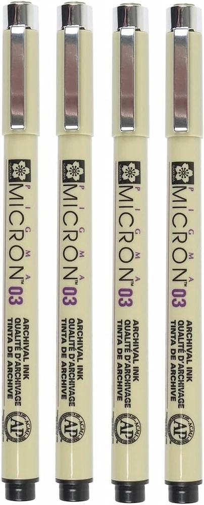 Permanent Pigment ink suitable for archival applications Water Based and quick drying on porous surfaces Fade resistant waterproof chemical resistant Sakura Pigma Micron 03 Black Pen 0.35mm Line Width Pack of 4 (03)