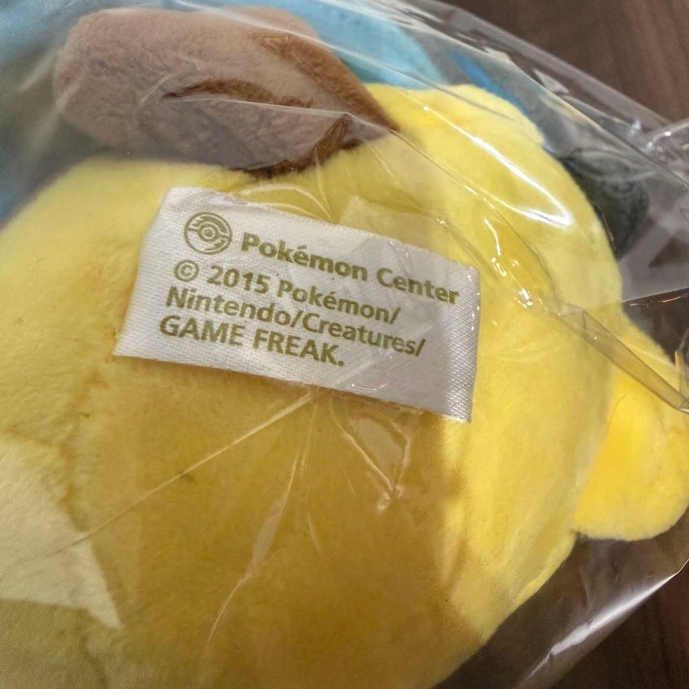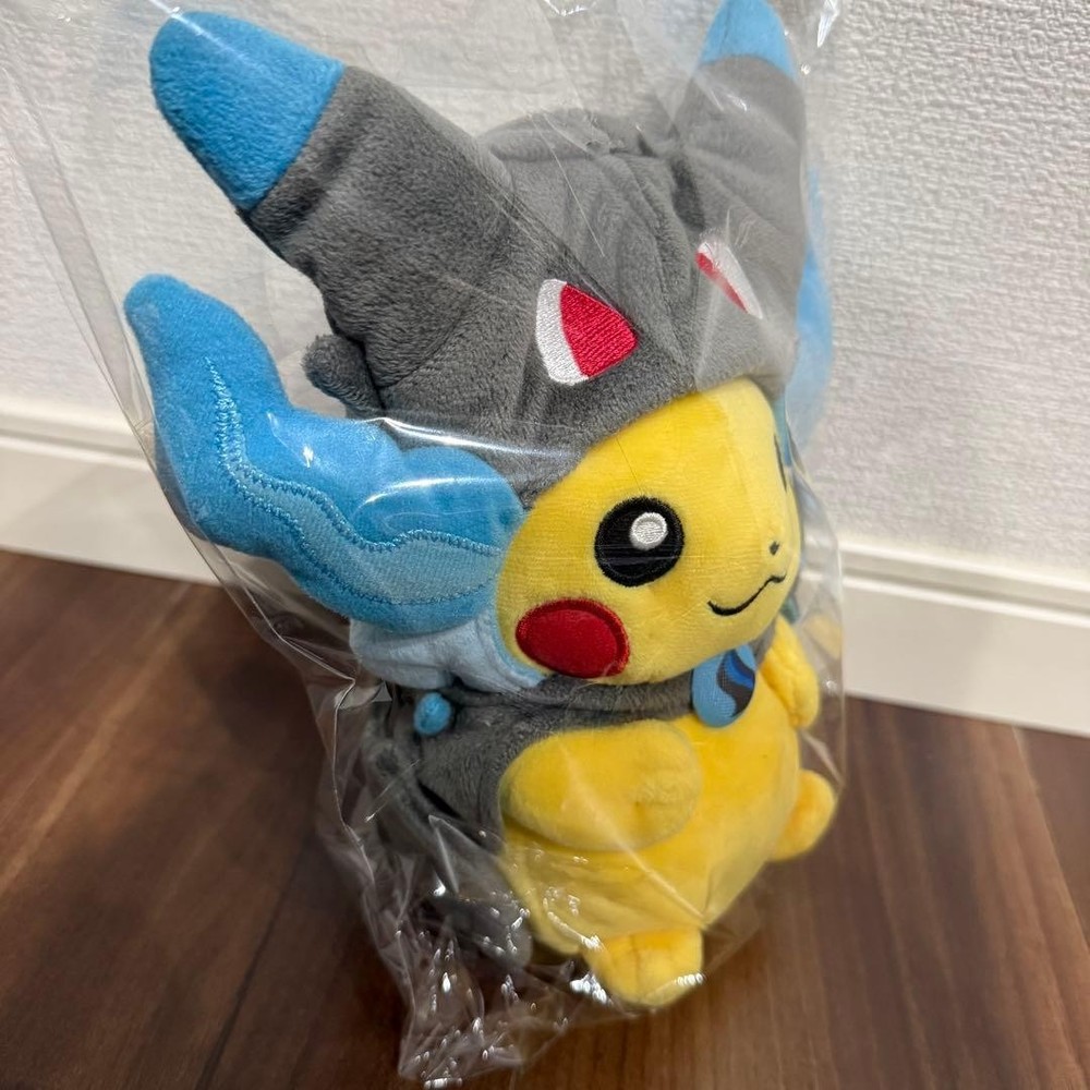Pikachu plush toy wearing a poncho from Mega Charizard X