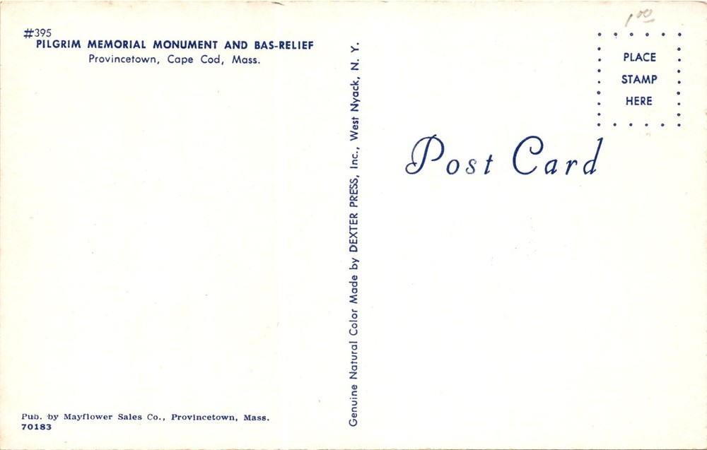 The front of the postcard features an image of the Pilgrim Memorial Monument and Bas-Relief in Provincetown, Cape Cod, Massachusetts. The monument is a historic landmark commemorating the landing of the Pilgrims in 1620. The bas-relief likely depicts scenes from this event. The postcard was published by Mayflower Sales Co.