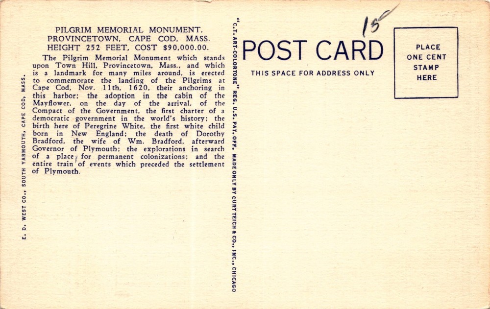 The postcard features the Pilgrim Memorial Monument in Provincetown, Cape Cod, Massachusetts. The monument is 252 feet tall and cost $90,000 to build.