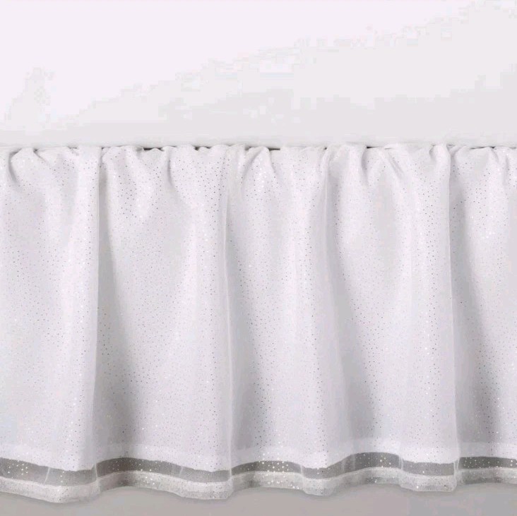 The Pillowfort Glitter Dot Tulle Kids' Bedskirt is a stylish addition to any Queen-sized bed, featuring a solid white color with a playful polka dot mesh design. Made from 100% polyester, this bed skirt adds a touch of glamour and whimsy to a bedroom, perfect for teens looking to add a pop of color to their space. With a non-woven fabric construction and the Pillowfort brand name, this bed skirt is both durable and fashionable, making it a great choice for any bedroom setting.