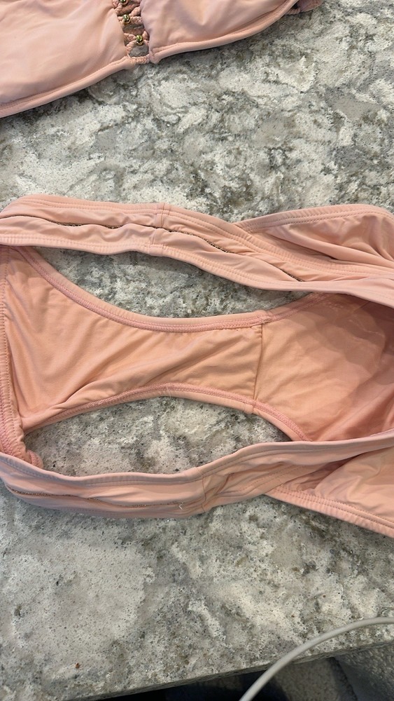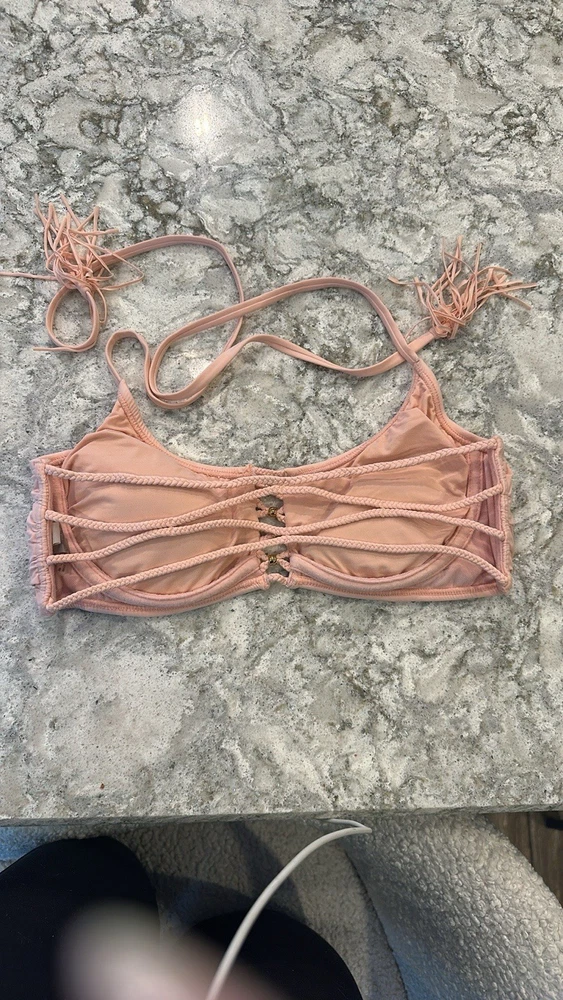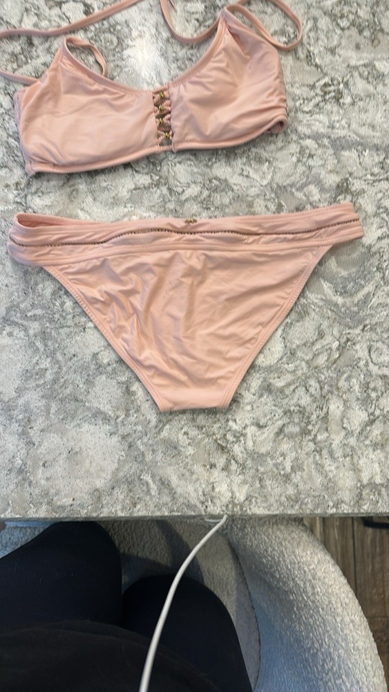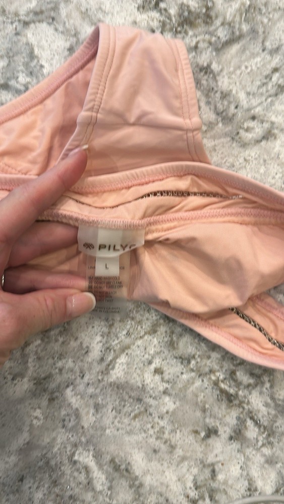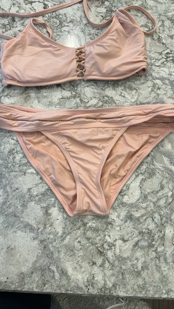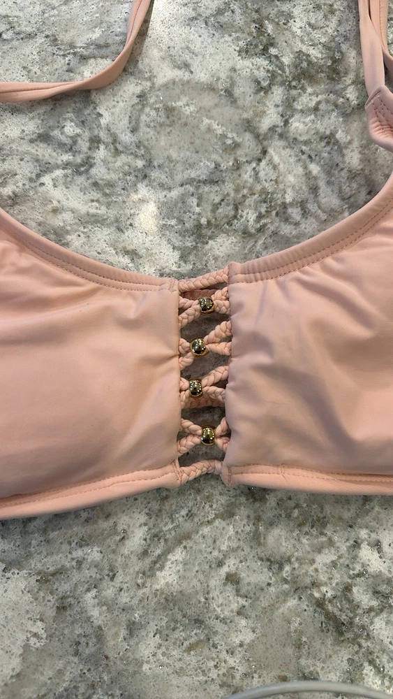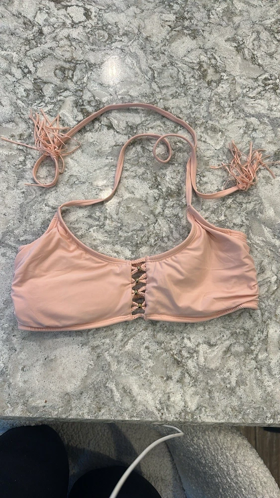 π PilyQ Blush Pink Bikini Set β Size Large β’ Includes both top and bottom β both size L β’ Soft blush pink with feminine detailing β’ Top features a lace-up center and adjustable halter ties β’ Bottom has a flattering banded waist with subtle cutout accents β’ Excellent like new condition β worn once