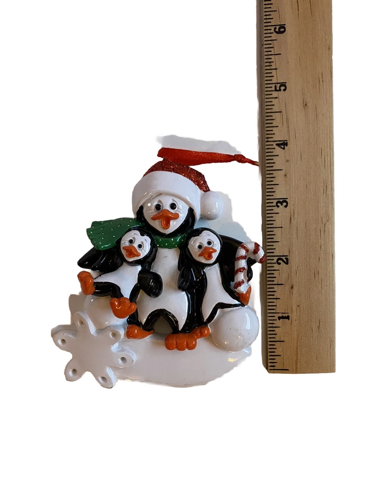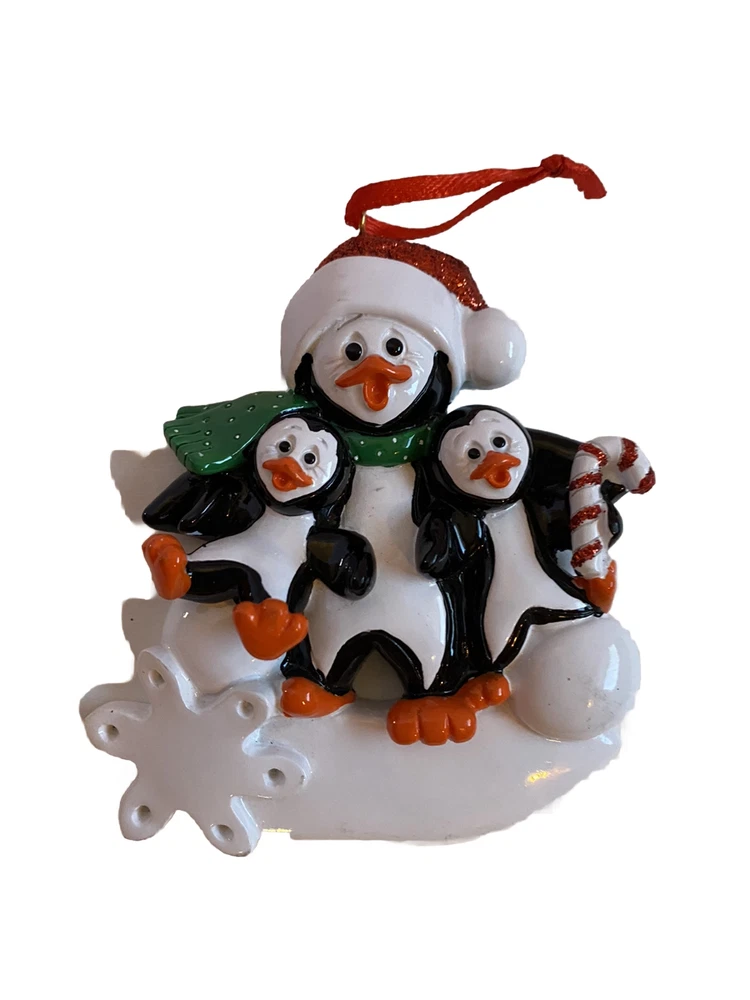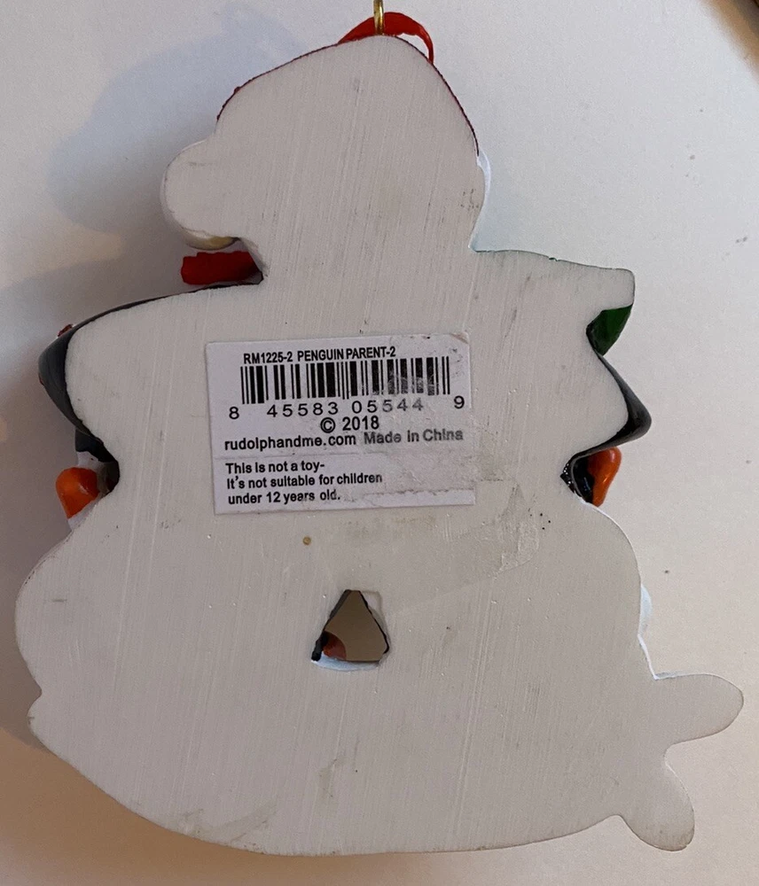 This Christmas ornament features a penguin family of 3, with adult and two young ones, holding hands on a 4-inch ornament. The ornament is made of acrylic, poly resin, and polyresin, and is waterproof, making it durable and long-lasting. It is a perfect holiday gift and keepsake for grandparent. The ornament is designed with a festive color scheme of red, white, green, black, and orange. This item weighs 3.6 oz and comes from Rudolph and Me, a trusted brand.