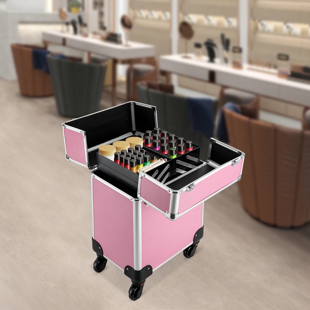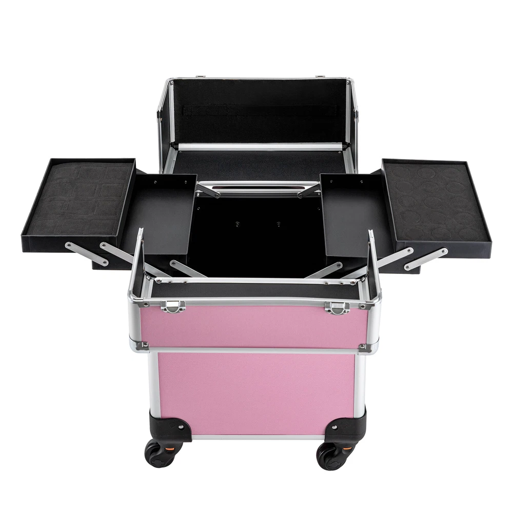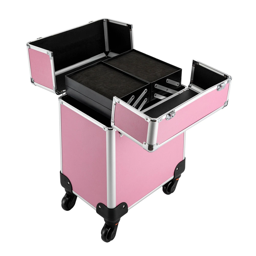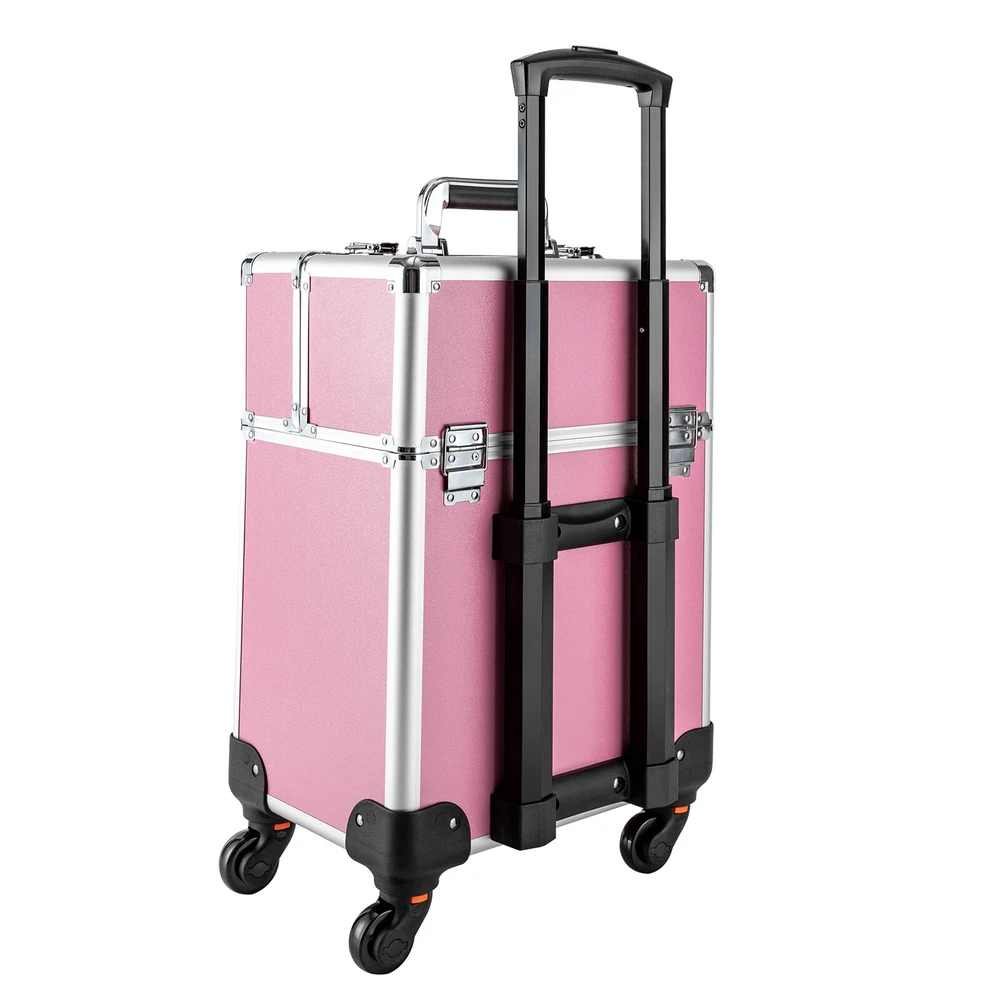 This pink rolling train case is a game-changer for makeup artists and beauty lovers! The sturdy aluminum alloy and ABS construction keeps everything secure, while the four spacious trays neatly organize all my cosmetics. The smooth universal wheels and retractable handle make it effortless to roll around, even fully loaded. The frosted finish gives it a sleek, professional look, and the latch opening ensures quick access. Perfect for travel or salon use—highly recommend for anyone who needs a durable, stylish, and ultra-functional cosmetic organizer!