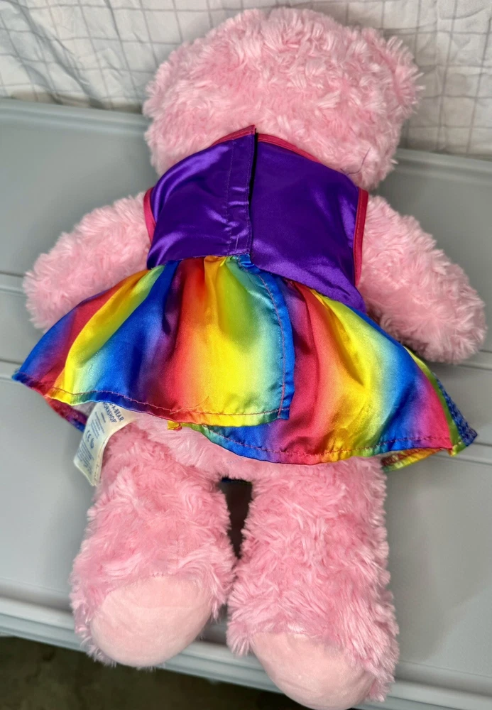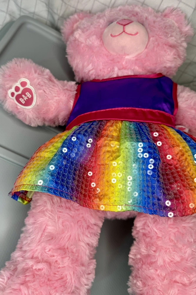 This adorable pink plush bear from Build-A-Bear Workshop is ready to make your heart skip a beat! With its charming blue eyes and colorful rainbow dress, this bear is sure to brighten up any room. Perfect for collectors or as a gift for someone special, this bear is made to be loved. Featuring a cute and cuddly design, this bear is sure to bring joy to anyone who receives it. The plush material and attention to detail make this bear a must-have for fans of the Build-A-Bear franchise. Don't miss out on the chance to add this lovely pink bear to your collection today!