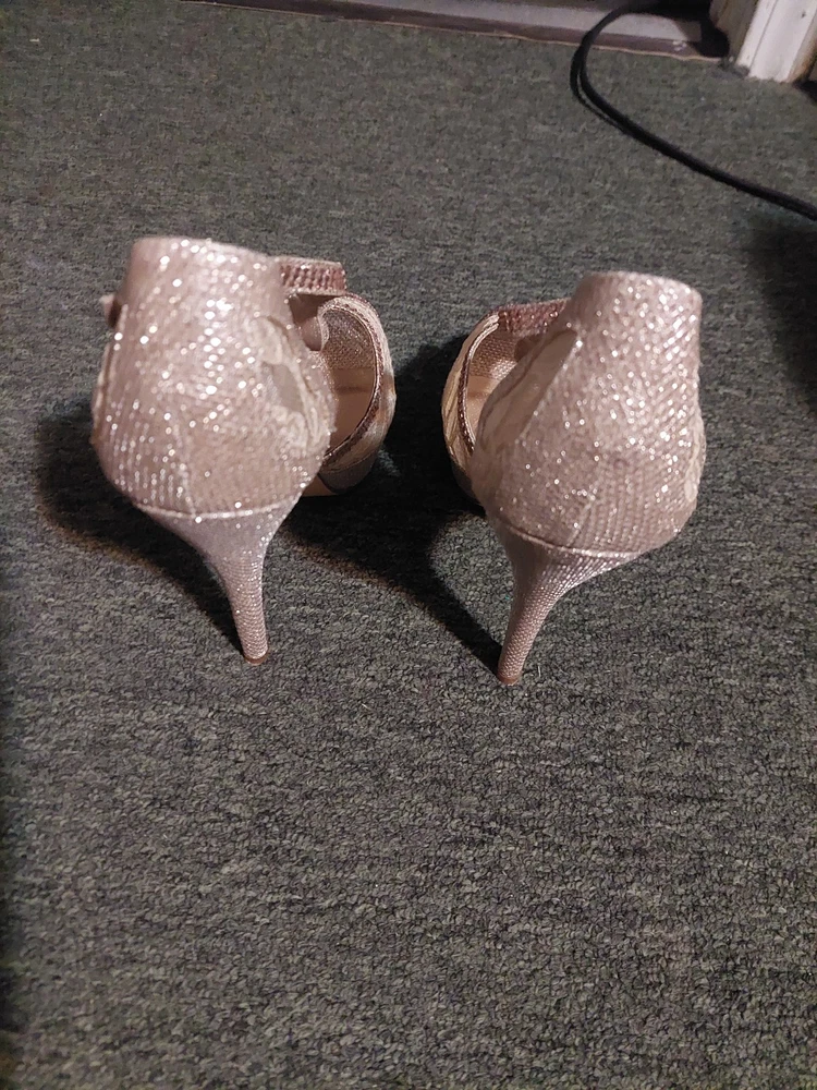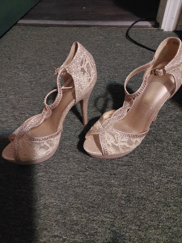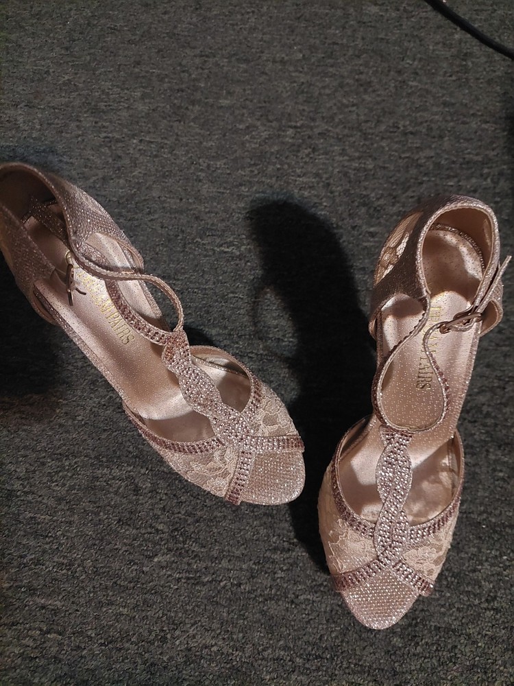 This is a pair of pink Dream Pairs dance shoes in size 7.5 for women. The heels are adorned with crystals, featuring a strappy style and made of synthetic material. Perfect for dancing or special occasions.