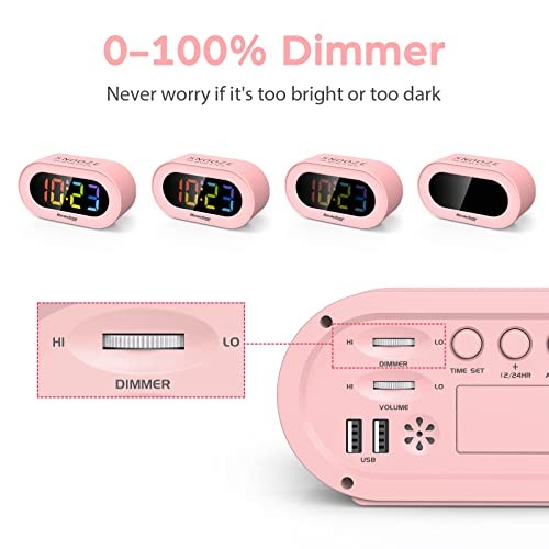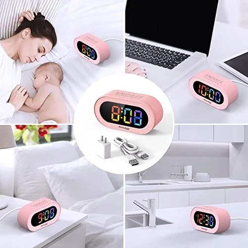 Return Policy Fast Delivery Trusted seller Pink Girls Alarm Clock, Dimmable Colorful LED Digital Display, USB Phone Charger Port, Simple Operation for Kids, Adults, Adjustable Volume, Snooze, Small Size for Bedrooms, Bedside, Desk Product Description Large LED rainbow numbers (1.2 in tall) are easy to read day or night. 0-100% dimmer, easy to get comfortable brightness. Small digital alarm clock (5.6 x 1.9 x 2.9 in) with an extra USB port enables to charge your phone, giving more space on your desk/ shelf/ nightstands. Enjoy a fresh morning with adjustable alarm volume from 30-85db. Simple press anyw on the top, get 10 minutes snooze. Simple operation for kids/ teens/ seniors, even no need instructions to use. Outlet Powered: Plug the clock into electrical source with included adapter (59 in). During power outage, 2* AAA batteries ( not included ) memory time and alarm settings, the display will go blank and alarm will not sound. Shipping Returns Payment Shipping Shipping is FREE to all addresses other than APO/PO boxes in the lower 48 states. All our stock ships from US-based warehouses. Shipped via USPS or UPS (depending on location and package weight) Unless stated otherwise, all orders will ship within 24-72 hours of your payment being processed. Check our feedback to see the great reviews of FAST shipping we offer. Returns Seller does not accept returns Payment We currently accept payment via eBay managed payments only. Once payment is cleared, we will dispatch your shipment within 1-3 business days. Please refer to the "Shipping" tab for more information regarding shipping speed to your destination.