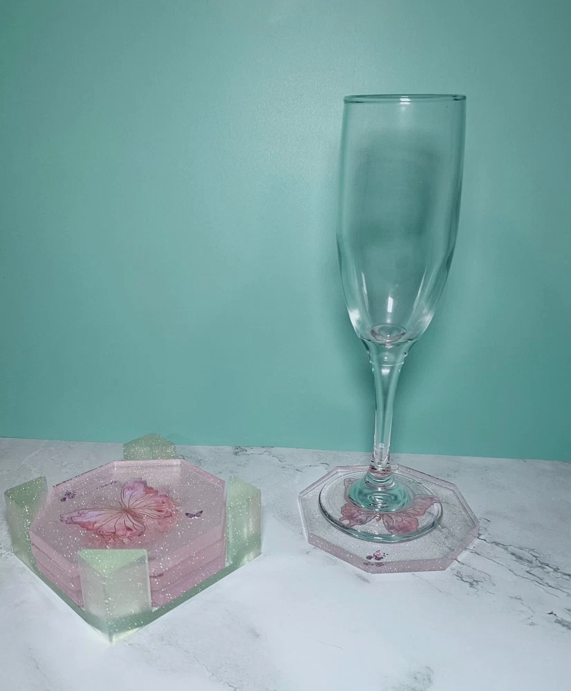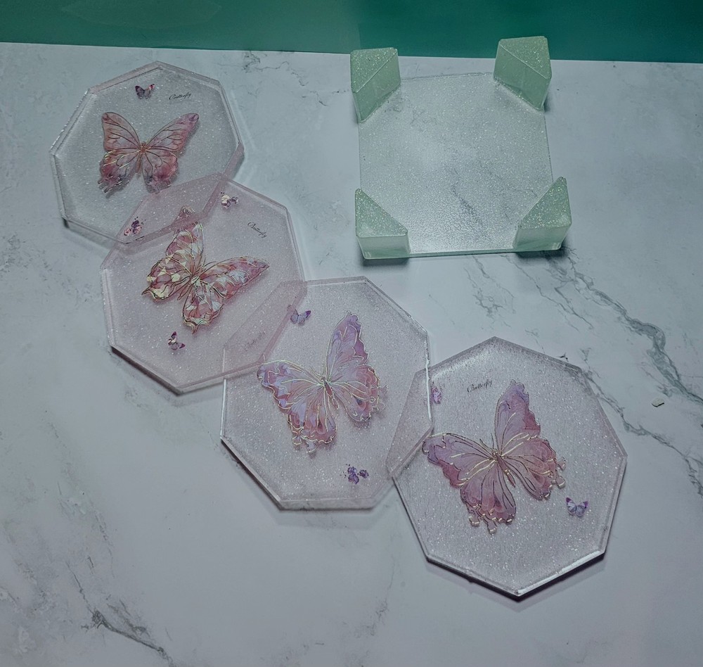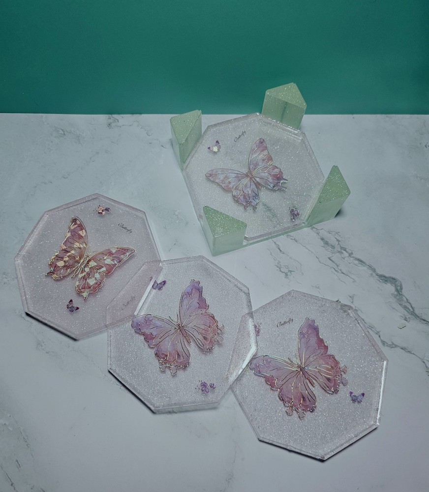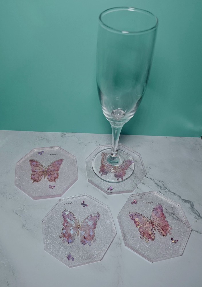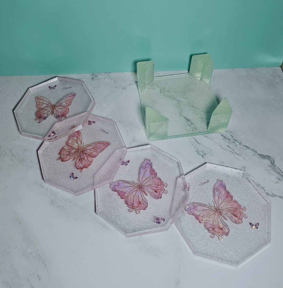This handcrafted 5-piece set of square coasters in pink glitter with butterfly design is perfect for all occasions. Made from resin material, each coaster has a diameter of 4 inches and features a modern style. The coasters are lightweight, stackable, and slip-proof, making them practical for use in your kitchen, dining room, or bar area. They also come with a rack/holder for convenient storage. Hand wash only to maintain their appearance. Made in the United States, this set adds a touch of elegance to your home decor.