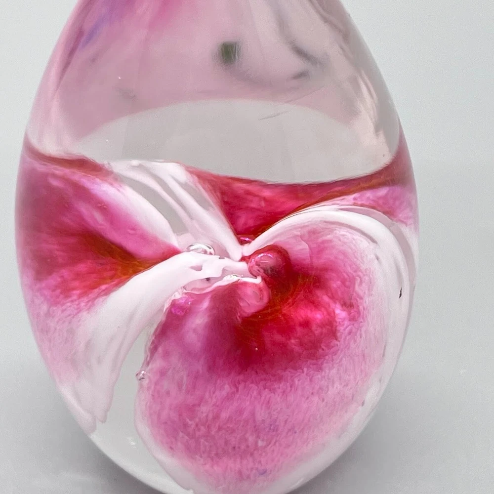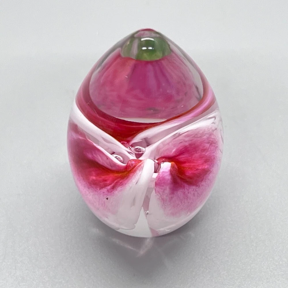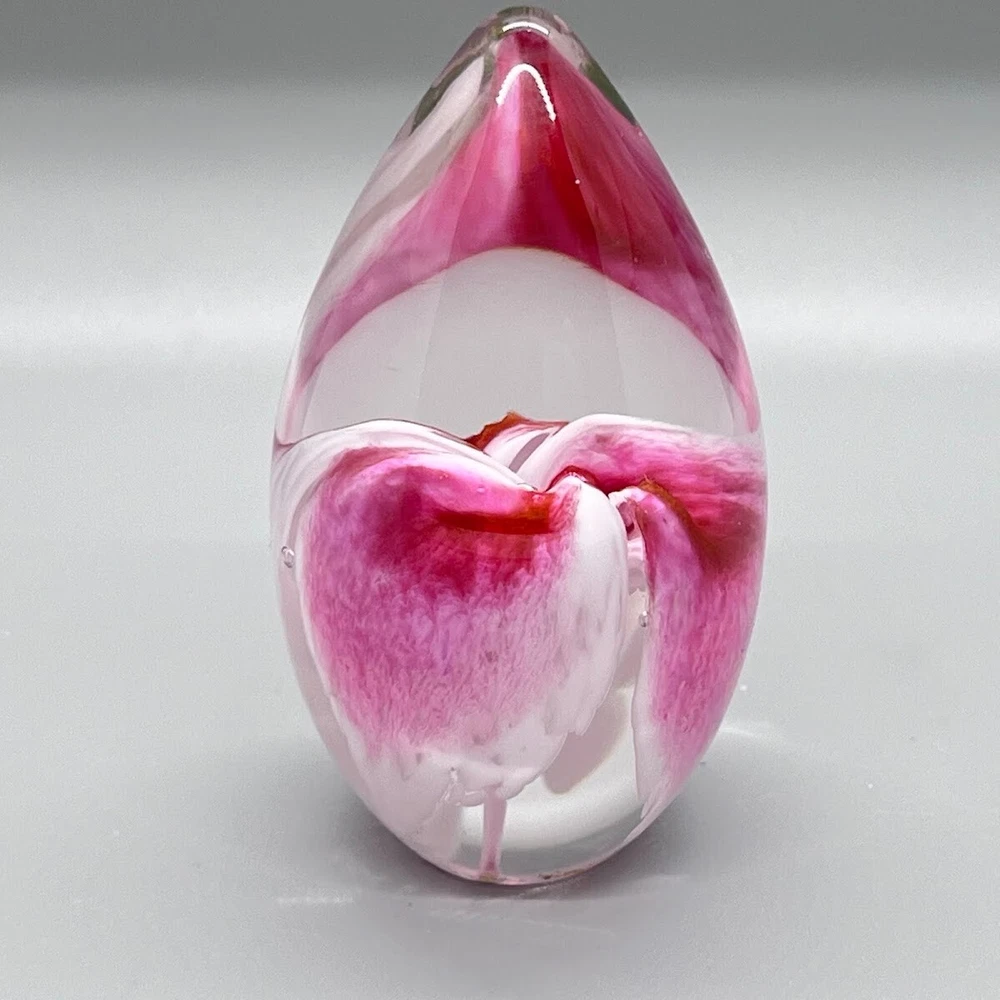 Pink Lily Paperweight Egg Shape Glass 3 Inches Tall Elevate your desk's charm with the Pink Lily Paperweight, a delightful addition to any collector's assortment or a thoughtful gift for someone who appreciates the elegance of art glass. This egg-shaped decorative piece, standing at a quaint 3 inches tall, is crafted from high-quality glass, showcasing a beautiful flower pattern that brings a touch of nature indoors. With its vibrant pink hue and intricate flower theme, this paperweight is not only functional but also serves as a stylish accent to your workspace or display shelf. Despite its unknown origin, the piece hails from the late 90s, adding a dash of vintage flair to your decor. Its artful design and glossy finish make it a standout accessory that blends sophistication with whimsy. 3" Tall x 1 1/2" Diameter