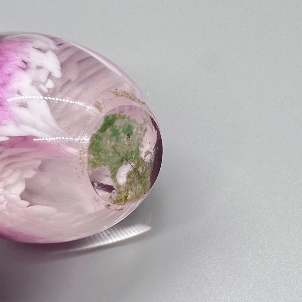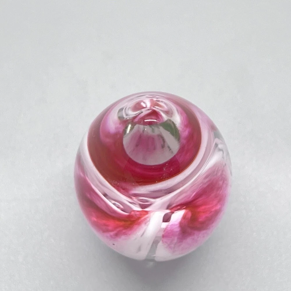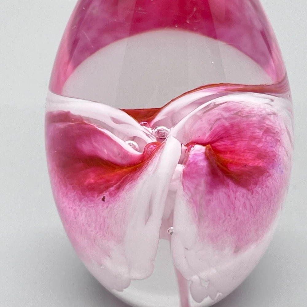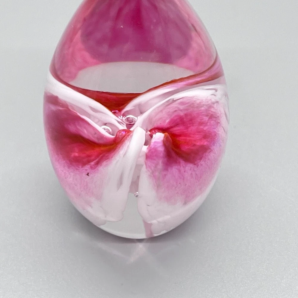 Pink Lily Paperweight Egg Shape Glass 3 Inches Tall Elevate your desk's charm with the Pink Lily Paperweight, a delightful addition to any collector's assortment or a thoughtful gift for someone who appreciates the elegance of art glass. This egg-shaped decorative piece, standing at a quaint 3 inches tall, is crafted from high-quality glass, showcasing a beautiful flower pattern that brings a touch of nature indoors. With its vibrant pink hue and intricate flower theme, this paperweight is not only functional but also serves as a stylish accent to your workspace or display shelf. Despite its unknown origin, the piece hails from the late 90s, adding a dash of vintage flair to your decor. Its artful design and glossy finish make it a standout accessory that blends sophistication with whimsy. 3" Tall x 1 1/2" Diameter