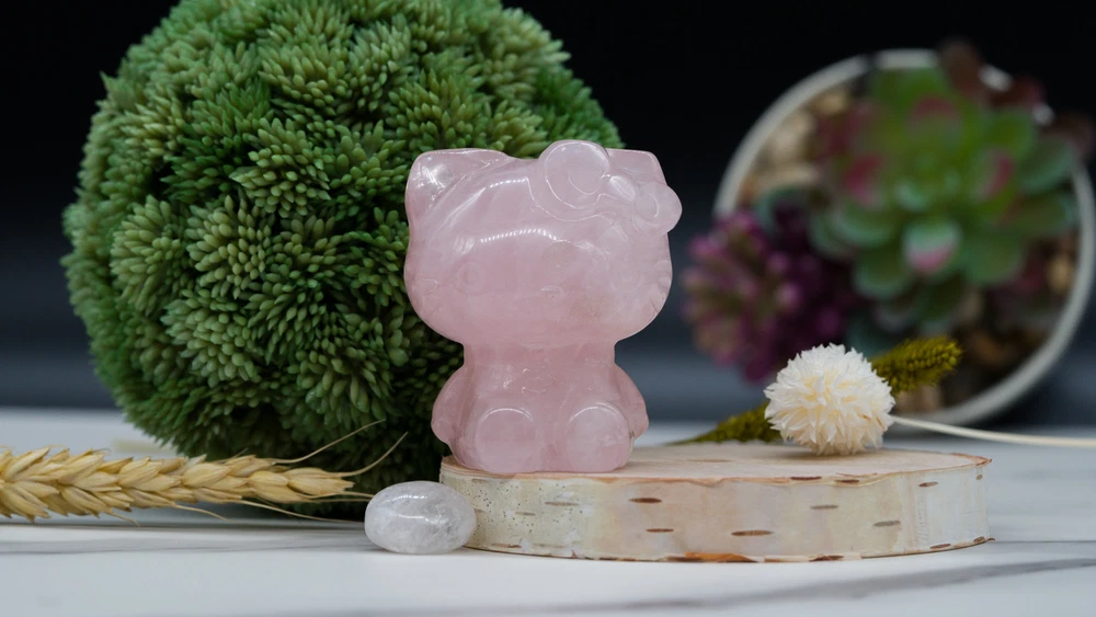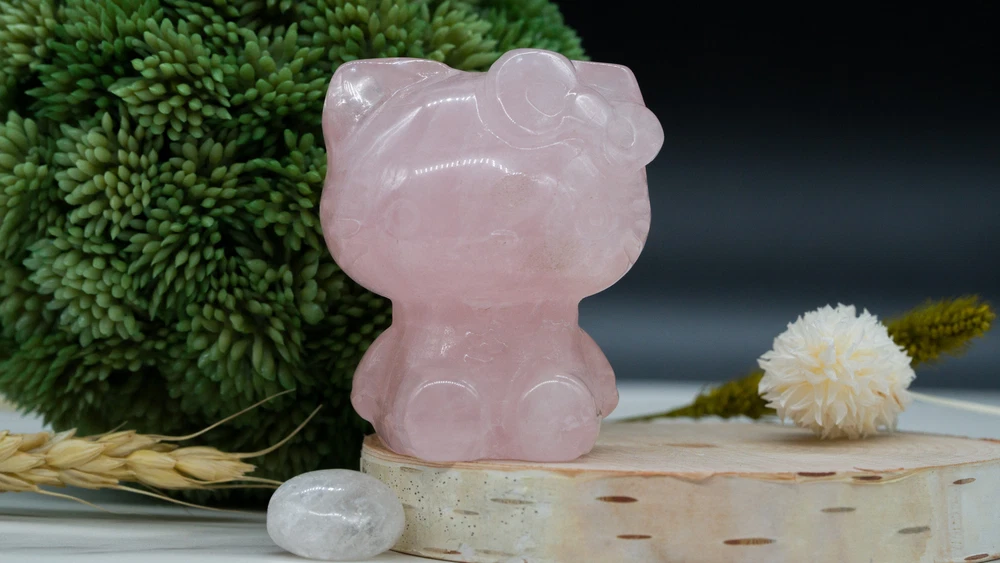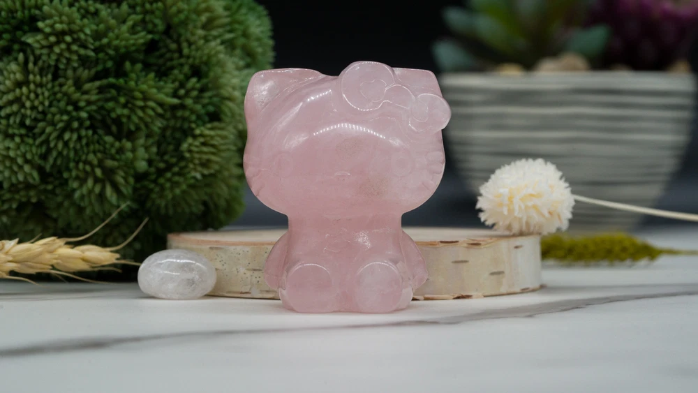 This cute Hello Kitty carving is made from natural pink rose quartz crystal and makes a great gift for yourself or a loved one! You will receive one (1) intuitively chosen crystal carving measuring approximately 2". Example photo has been provided for approximate size reference. Rose Quartz is associated with the heart chakra and is said to restore trust and encourage love, emotional healing and growth, and compassion. It is a macro-crystalline mineral: this means that crystals can be harvested as large intricate raw crystals. Like all Quartzes, Rose Quartz is a compound of SiO2. Given that, it is identified from other Quartzes both scientifically by its microstructure and by its color. Gems and crystals are great for altars, grids, terrariums, pocket stones, gifts, home decorating, jewelry, collecting and more! They are also wonderful additions to meditation, spiritual, and chakra work. *This listing uses professional photography to provide samples of our collection of products. Each stone is natural, unique and beautiful so please expect slight variations in color, texture, and size. You will receive a product similar to that of the picture, but not the exact product. **Please note that healing crystals are not a replacement for traditional medical treatment and are not meant to replace consulting with a medical professional and do not guarantee any medical cure for any condition. ***This is not an officially licensed Sanrio product, and only features the likeness of the character Hello Kitty on a fanart basis.