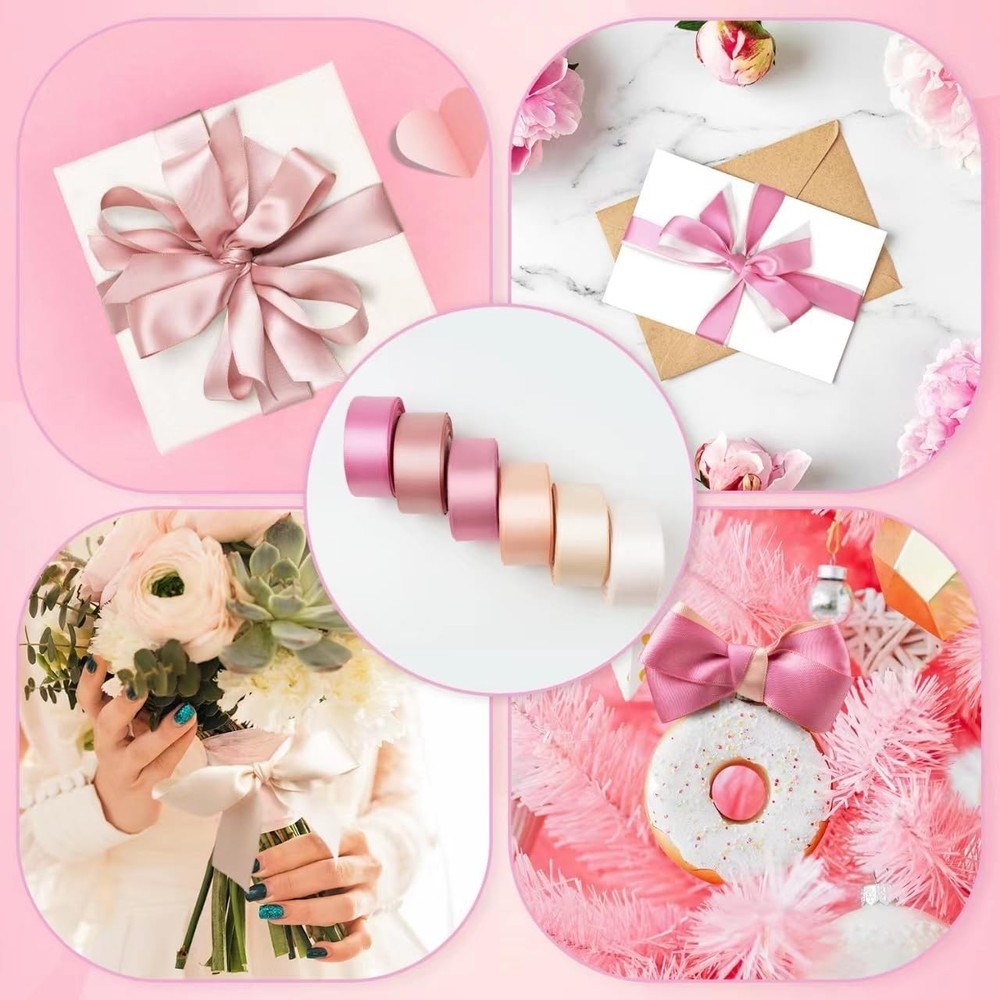 Solid Color Double Faced Satin Ribbon 6 Rolls Set - 1 Inch × 60 Yards 6 Rolls of Pink Ribbons: The set includes 6 different shades of pink ribbons, including pink ribbon, dusty rose ribbon, rose pink ribbon, rose gold ribbon, nude ribbon and rosy white ribbon, creating a gentle, romantic and elegant ambiance. Premium Double-Sided Satin Ribbon: These silk satin ribbons are made of expensive and high-quality polyester fabric, making them smoother, finer, and more textured compared to regular fabrics. The fabric is double-sided, with both sides equally refined, high density, neat edges, and is durable, preventing deformation even with stretching or pulling. Multi-purpose Decorative Ribbon: Our high-quality double-faced satin ribbon is an excellent decorative ribbon with a wide range of applications. It can be used for decorating flower bouquets, gift wrapping, wedding invitations, cake decorations and more. It is also suitable for indoor decoration, such as birthday background banner, chair backs, walls, doors and windows. Additionally, it can be utilized in crafting projects, such as making front door wreaths, hair bows, headbands, and neckties, among others. Versatile Silk Satin Ribbon: Silk satin ribbon is suitable for various occasions and can be used in weddings, holiday celebrations, Christmas, Thanksgiving, Valentine's Day, Easter, birthday parties, baby showers, graduation ceremonies, and more. It is perfect for gift wrapping, crafting and decorating the venue, adding beauty and creating a special atmosphere. Product Details: Size: 1 inch wide Color: Pink / Dusty Rose / Rose Pink / Rose Gold / Nude / Rosy White Material: Polyester Quantity: 6 rolls Single roll length: 10 yards / 30 feet Total length: 60 yards / 180 feet 【6 Rolls of Pink Ribbons】The set includes 6 different shades of pink ribbons, including pink ribbon, dusty rose ribbon, rose pink ribbon, rose gold ribbon, nude ribbon and rosy white ribbon, creating a gentle, romantic and elegant ambiance. They are suitable not only for elegant occasions but also for decorating cute and lively events such as baby shower parties. The six colors can be freely combined and matched to meet different occasions and design needs. 【Premium Double-Sided Satin Ribbon】These silk satin ribbons are made of expensive and high-quality polyester fabric, making them smoother, finer, and more textured compared to regular fabrics. The fabric is double-sided, with both sides equally refined, high density, neat edges, and is durable, preventing deformation even with stretching or pulling. They always present a delicate, noble, and elegant appearance, making them the best choice for gift wrapping, DIY crafts, and various decorations. 【Affordable Ribbon Assortment Set】The ribbon width is 1 inch, with a length of 10 yards per roll, and a total of 6 rolls in different colors, totaling 60 yards. The ample length caters to your various crafting or decorating needs, allowing you to cut it into any desired length. You can also use two or more different colored ribbons simultaneously to decorate your projects, ensuring they become a highlight. 【Multi-purpose Decorative Ribbon】Our high-quality double-faced satin ribbon is an excellent decorative ribbon with a wide range of applications. It can be used for decorating flower bouquets, gift wrapping, wedding invitations, cake decorations, birthday background banner, chair backs, walls, doors, windows and more. Additionally, it can be utilized in crafting projects, such as making front door wreaths, hair bows, headbands, and neckties, among others. 【Versatile Silk Satin Ribbon】Silk satin ribbon is suitable for various occasions and can be used in weddings, holiday celebrations, Christmas, Thanksgiving, Valentine's Day, Easter, birthday parties, baby showers, graduation ceremonies, and more. It is perfect for gift wrapping, crafting and decorating the venue, adding beauty and creating a special atmosphere.