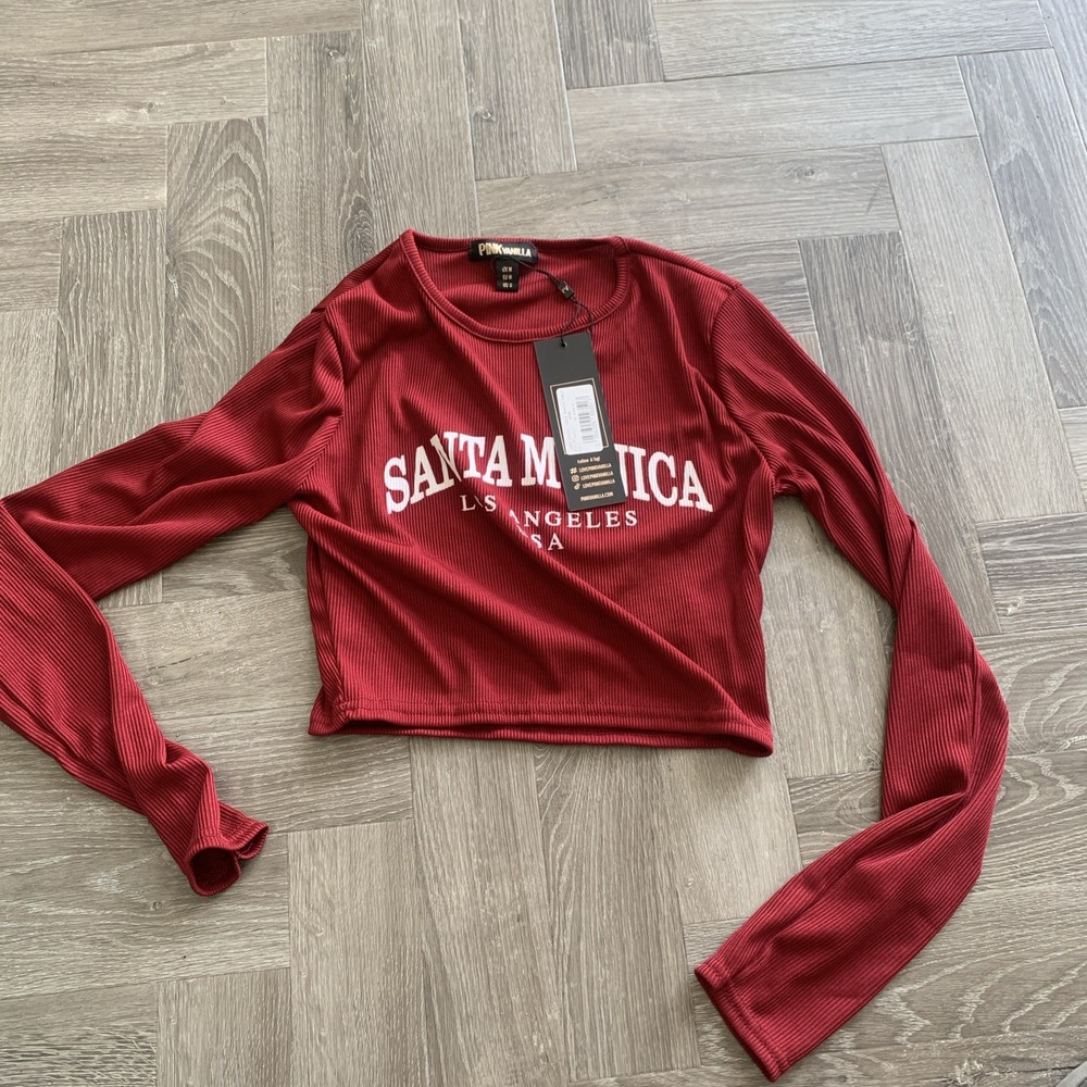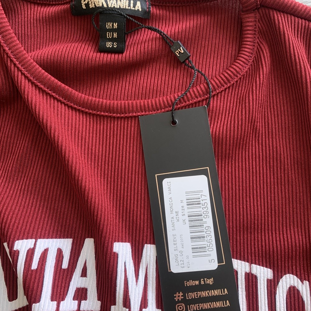 The Pink Vanilla crop top T-shirt in size small is a stylish and versatile addition to any woman's wardrobe. Made from a blend of polyester and elastane, this burgundy top features long sleeves and a cropped style, perfect for showcasing your favourite outfits. Easy to care for with its machine washable design, this T-shirt is a trendy and comfortable choice for everyday wear. Bnwt