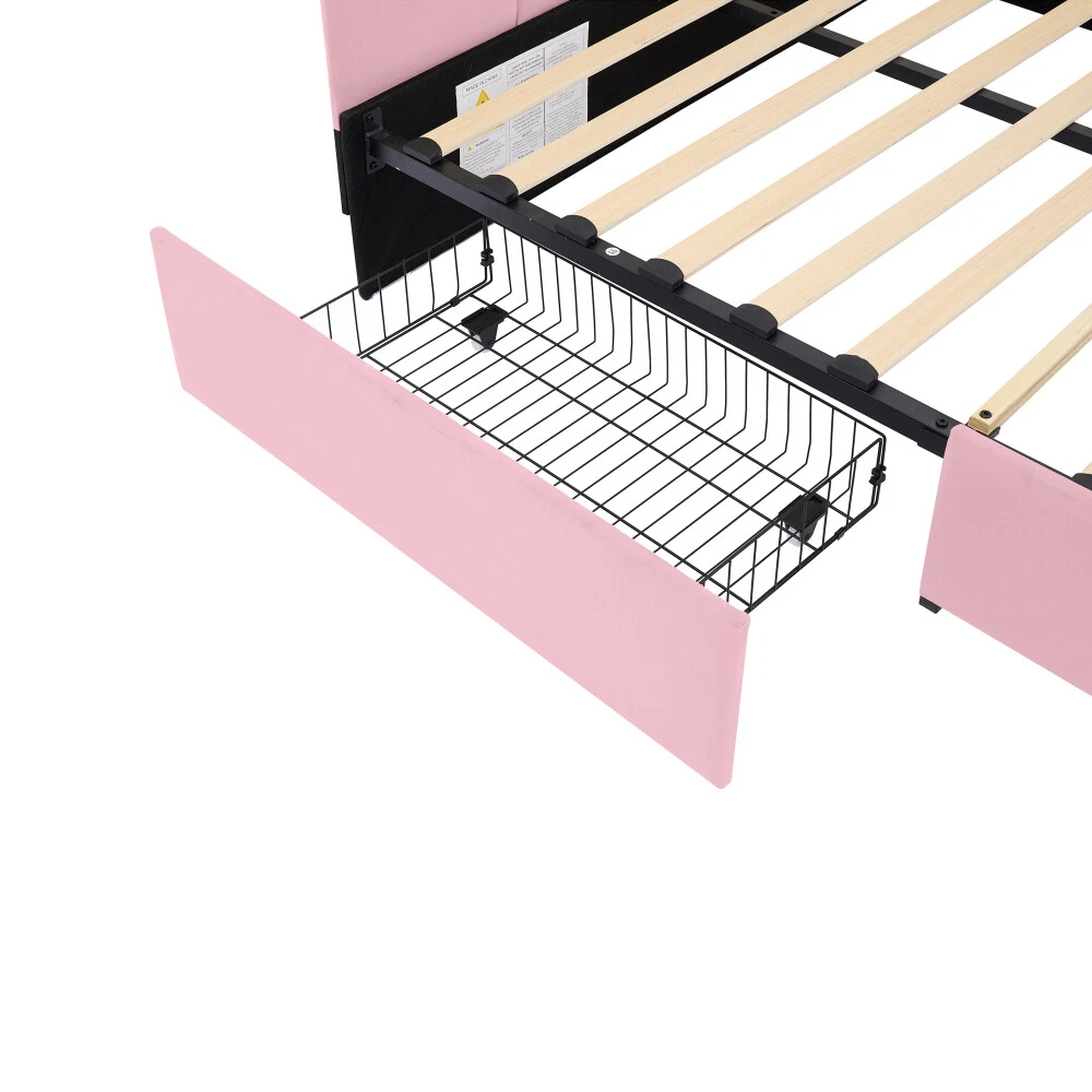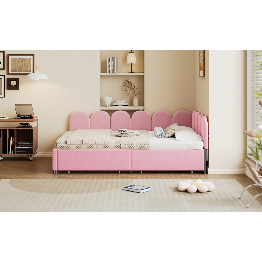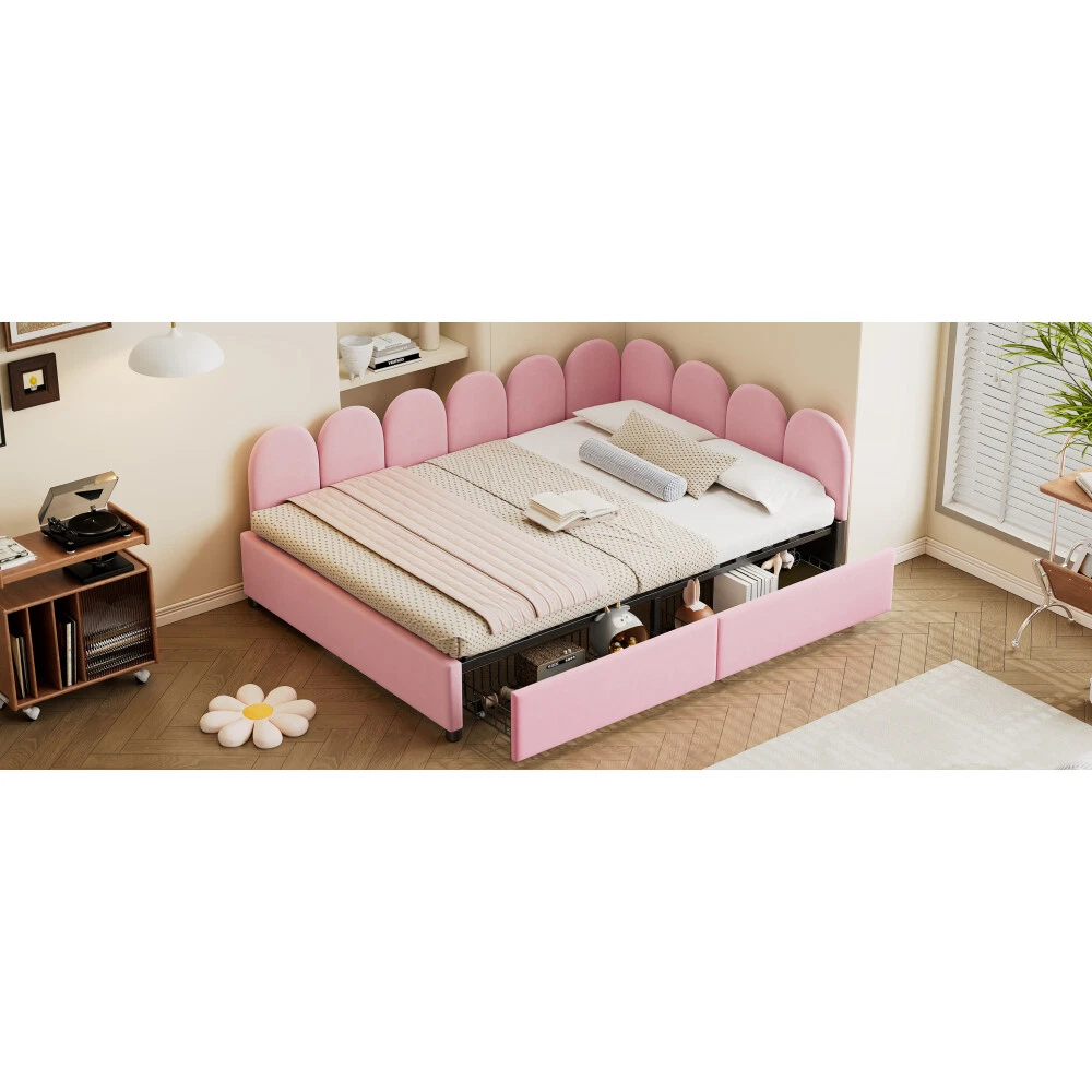 Comfortable Fabric: This upholstered daybed is made of selected velvet, soft fabric headboard provides a comfortable and warm sleeping environment. Elegant Design: This daybed is not only suitable for any home decoration, but also loved by children.The diagonal design of the headboard allows this bed to be placed in a corner, saving space and making it more comfortable. 2 Large Drawers: This daybed has 2 drawers for storing clothes, books, toys, etc. It is very practical and makes full use of the space. Solid Construction: Made of high-quality MDF, the frame of this bed is not easy to be affected by humidity change and lead to crack. The strong legs, wide boards and 12 slats for bed, not only improve the weight capacity of the bed greatly but also ensure the stability. Dimensions and Assembly: Overall Product Dimension: 78"L X56.2"W X 27.69"H. Suitable for full size mattresses. Full size Upholstered Daybed with 2 Drawers, Velvet Sofabed with Soft Fabric Headboard, Rose Red This daybed is made of selected velvet, elegant white,rose red or pink, with tufted shape headboard, elegant and cute, not only suitable for any home decoration, but also loved by children. A soft fabric headboard provides a comfortable and warm sleeping environment. This daybed is a valuable choice as it does not require a box spring or foundation. Just place your mattress on top and enjoy it. With our daybed, relaxation meets efficiency, making it the perfect addition to any modern home.