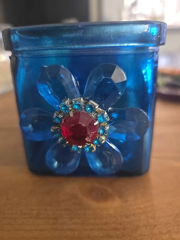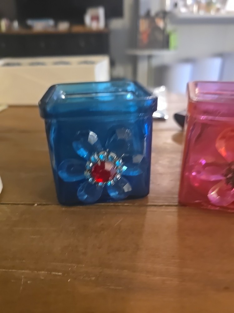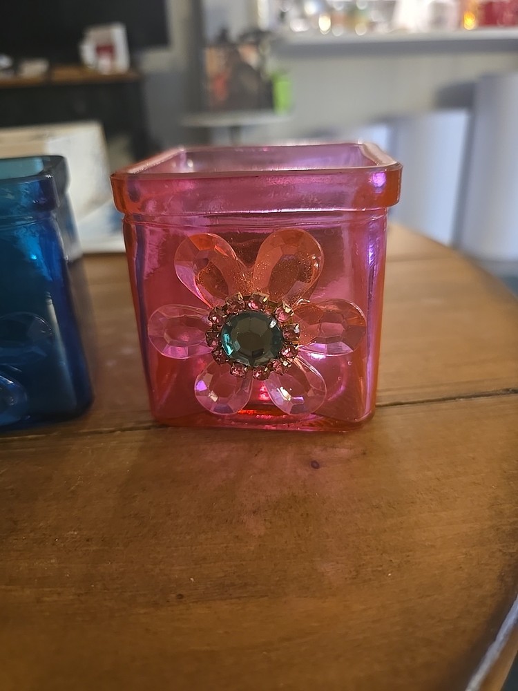 The Luminescence Pink Glass Candle Holder features a square shape with a small size, adorned with pink flowers. It is made of glass and has a tabletop style. The candle holder comes in two variations: one with a pink flower and the other with a blue flower. This Luminessence Candles model is perfect for adding a touch of floral elegance to your home decor.