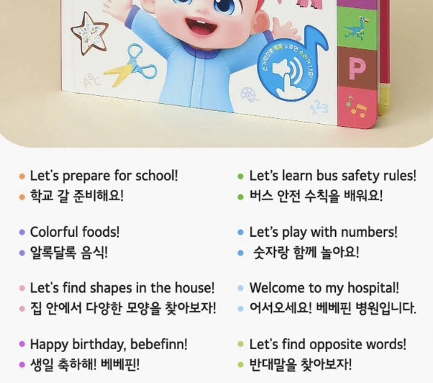 This Pinkfong Bebefinn English Korean Sound Touch Book is a perfect addition to your child's language learning collection. With a publication year of 2024, this soundbook is a modern and interactive way to teach your child the alphabet and words. It features both English and Korean languages and is authored by Pinkfong, a trusted name in children's entertainment. This book is a great way to introduce your child to the world of language learning. It is a perfect fit for children of all ages and provides a fun and engaging way to learn. The soundbook is published by Pinkfong and is available in a book format. It is a great resource for parents who want to help their children learn language skills.
