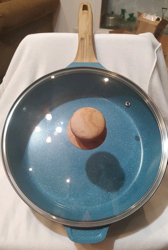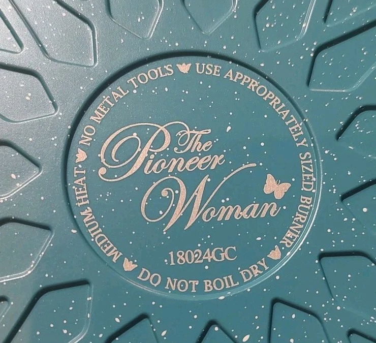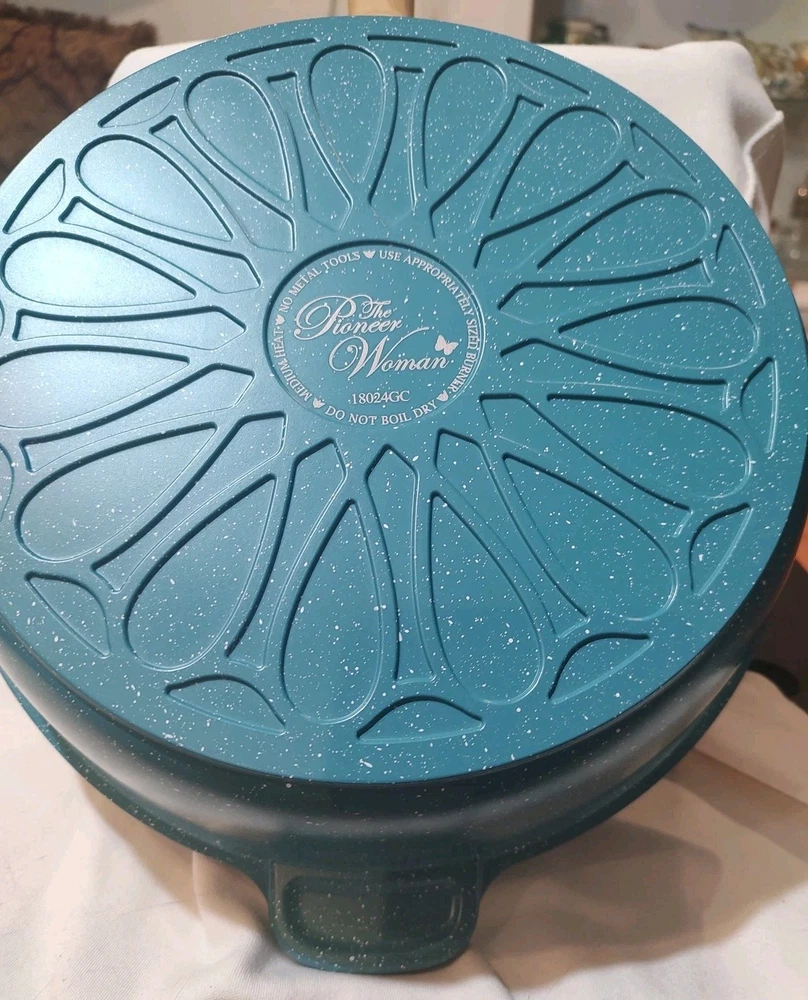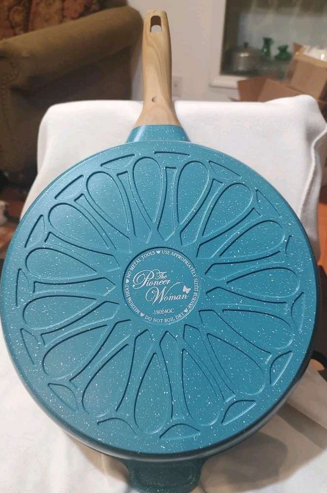 Pioneer Woman 4 Qt. Skillet Teal Speckle Cast Aluminum W/ Lid, New, *No Box, new from opened boxed set.