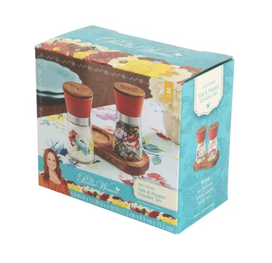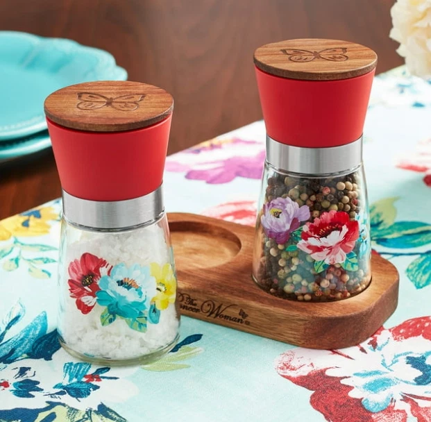 The Pioneer Woman Sweet Romance 3-Piece Salt & Pepper Grinder Set πΈπ§ β Stylish & Functional β Beautiful floral design with bright red tops adds a pop of color to your kitchen β Durable Glass Grinders β Corrosion-resistant ceramic mechanisms for smooth grinding β Premium Acacia Wood Accents β Elegant wood caps and coordinating storage tray β Easy to Refill β Simply unscrew the top cap and fill with peppercorns, sea salt, or Himalayan salt β Perfect for Everyday Use β Keeps spices fresh and ready for cooking or dining π Set Includes : 2 Glass Grinders (with acacia wood caps) 1 Acacia Wood Storage Tray π Dimensions : 6.8" L x 3.5" W x 6" H π§Ό Care : Handwash only β¨ Add a farmhouse touch to your seasoning routine today!