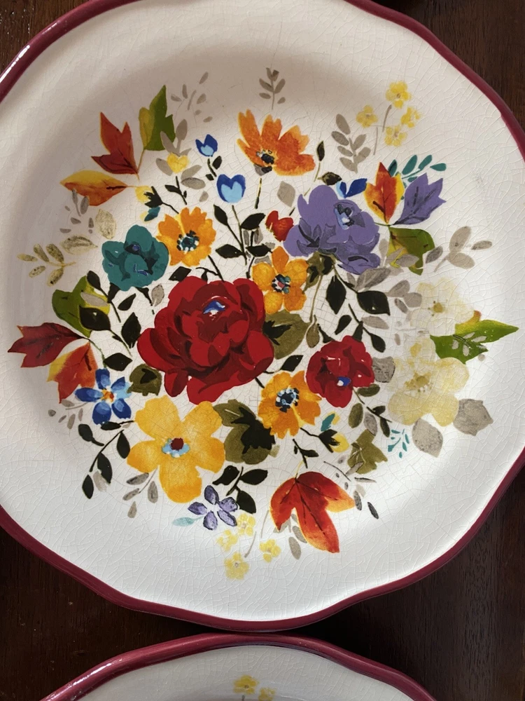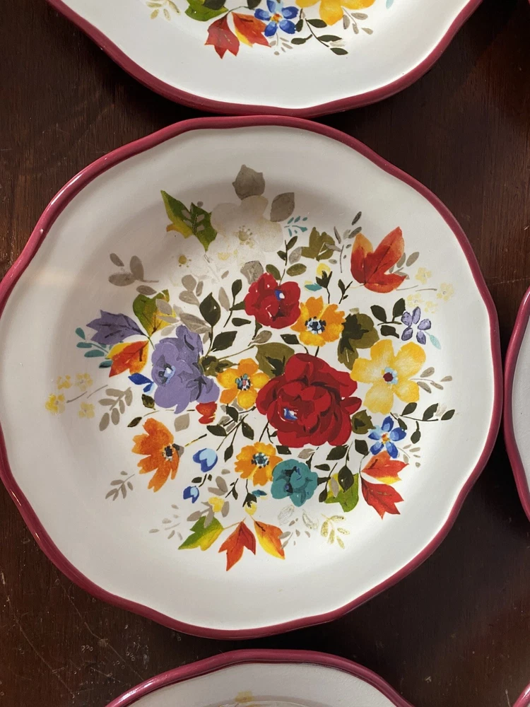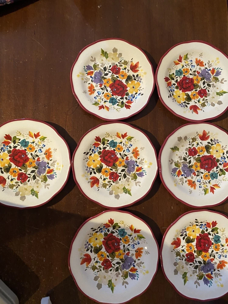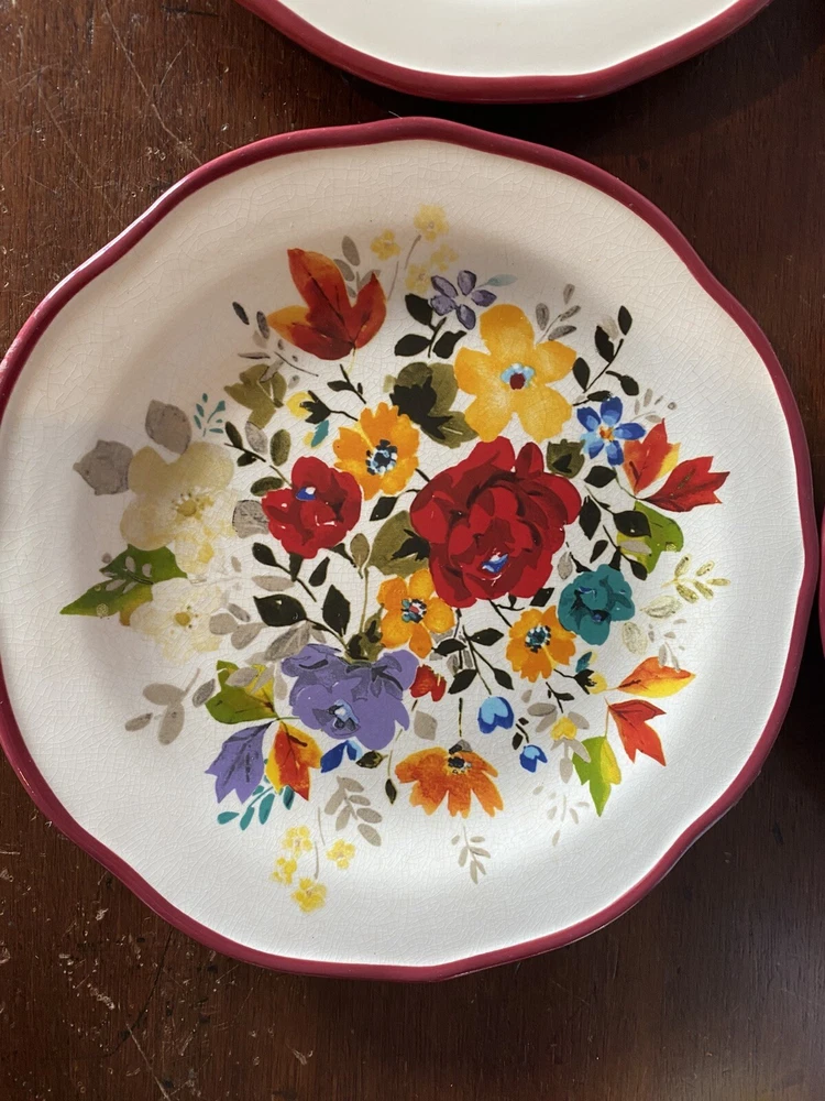 Pioneer woman set of seven red floral luncheon plates. Three of the plates have some crackling on them three do not. There are also 2 small nicks on two of the rims of the plates and one small stain on one. Please see pictures.