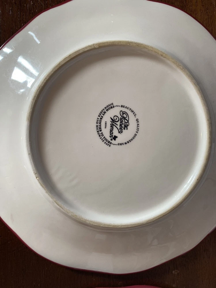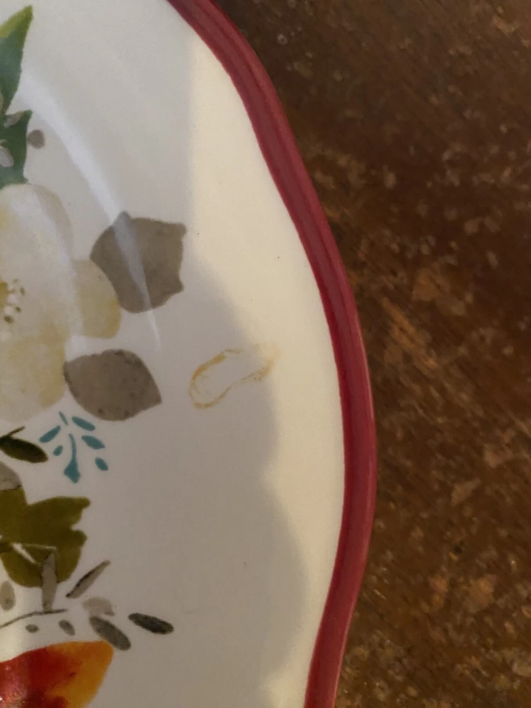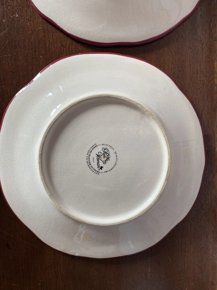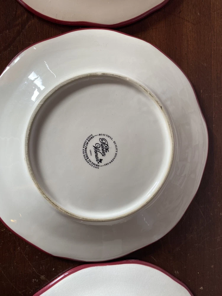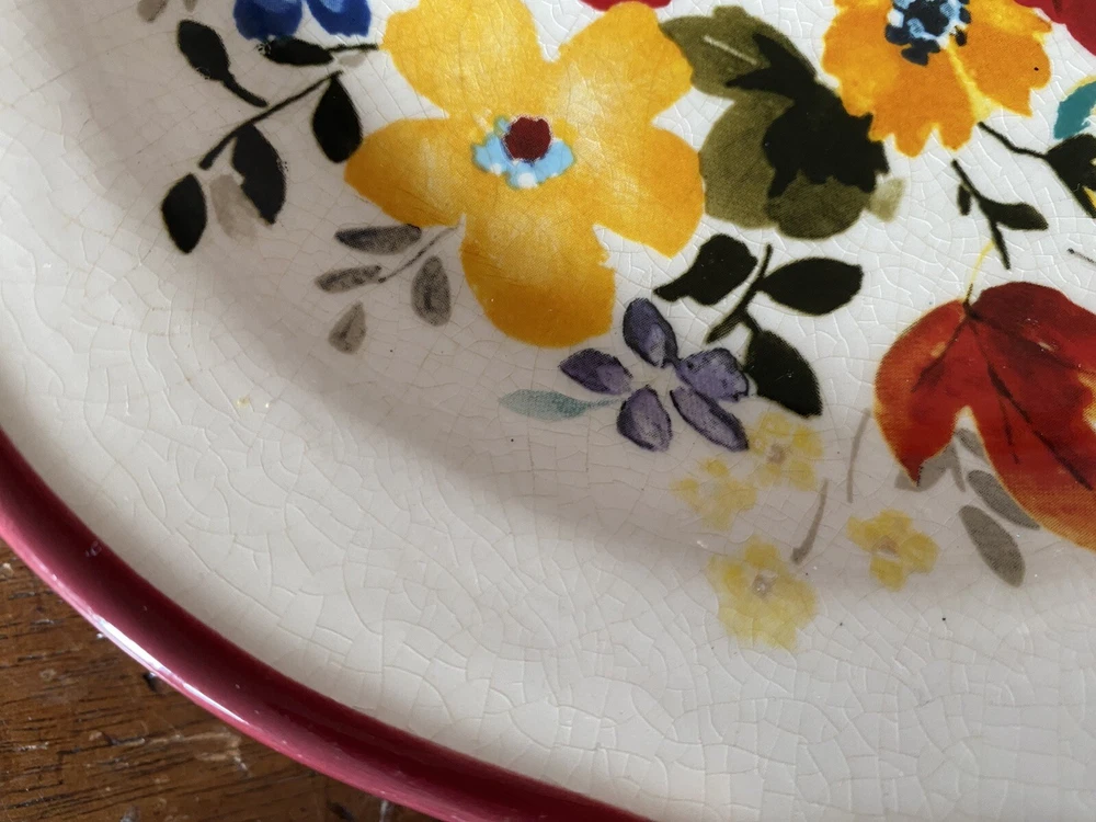 Pioneer woman set of seven red floral luncheon plates. Three of the plates have some crackling on them three do not. There are also 2 small nicks on two of the rims of the plates and one small stain on one. Please see pictures.