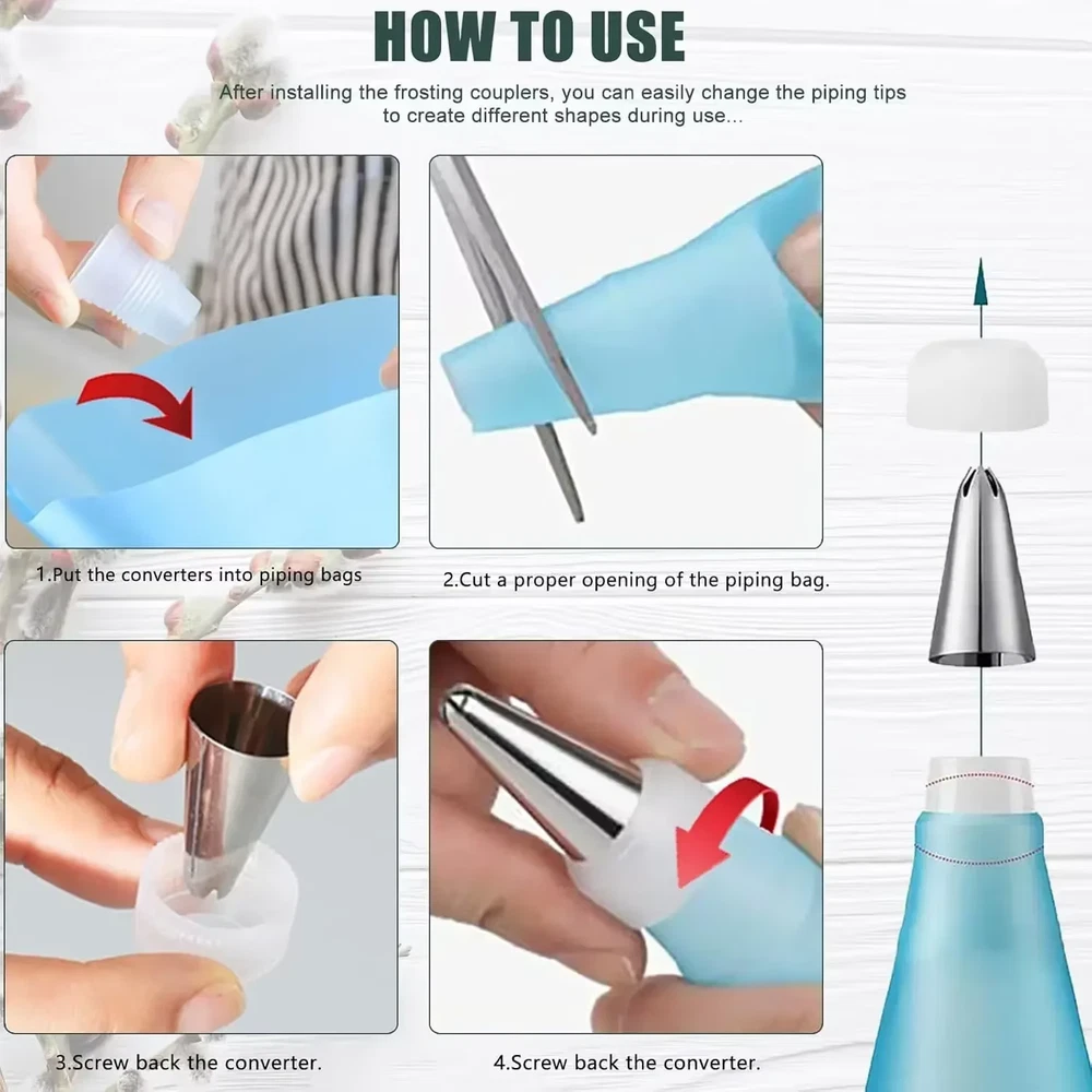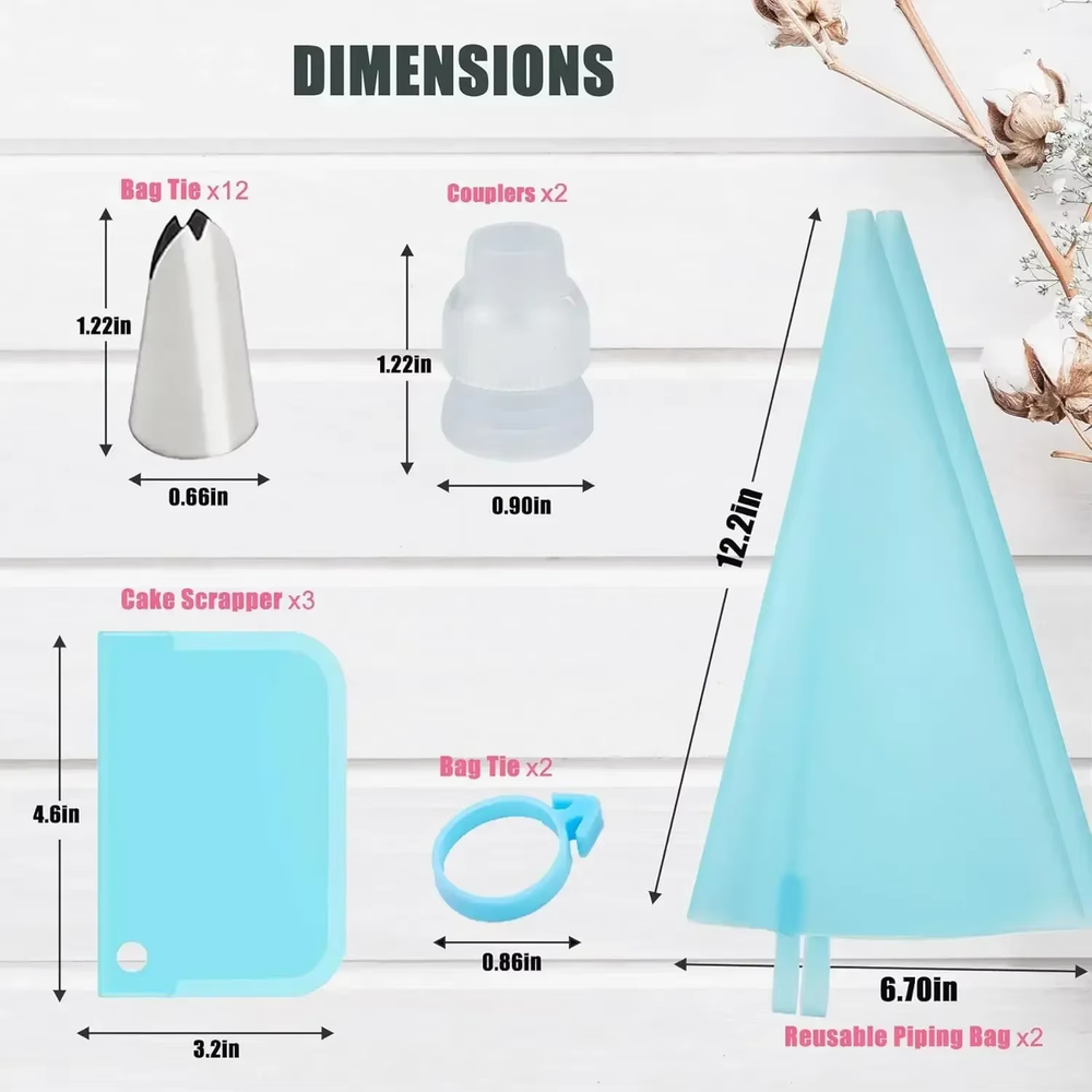 Product Description Strong & durable piping bag made with stainless-steel tips - Corrosion-resistant & reusable to help you create beautiful designs with ease. Use these bags for a variety of desserts - From sugar cookies to chocolate, donuts, macarons, cupcakes, and more, the possibilities are endless. 1 , Complete Piping Bag Set : This set includes 12 stainless steel icing tips, 2 reusable silicone pastry bags, 2 plastic couplers, 2 silicone rings, and 3 cake side scrapers. It has everything you need for easy and affordable baking decoration. Reusable and Durable Pastry Bags : The pastry bags are made of food-grade silicone, which is soft, flexible, corrosion-resistant, non-stick, and non-toxic. They can withstand powerful extrusion and are easy to wash. The outside also has a good anti-slip property for a comfortable grip. 2 , Easy to Use and Clean : You can trim the pastry bags to fit any decorating couplers and tips. The smooth interior makes them easy to squeeze and wash, while the anti-slip exterior provides a good grip for precision decorating. 3 , Create Beautiful Baking Designs : With this cake decorating set, you can make stunning flowers and patterns on cakes, cupcakes, cookies, and more. Impress your friends and family with your professional-looking creations. 4 , Enjoy Your Family Time : This piping kit comes with a lifetime warranty and a 60-day money-back guarantee. You can try it risk-free and have fun with your loved ones. Whether it's for a wedding, a birthday, or a holiday, this deviled egg piping bags and tips set kit tool will help you decorate delicious desserts for any occasion.