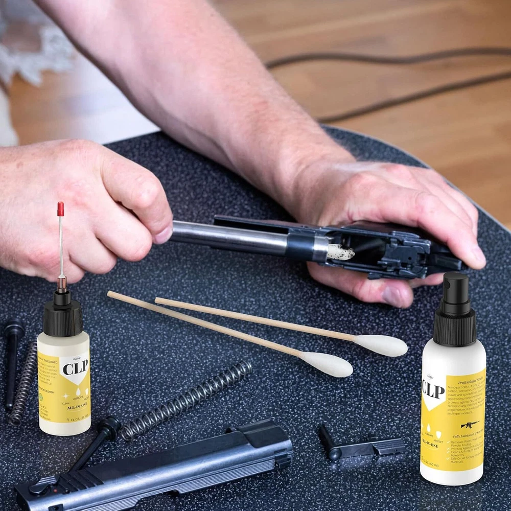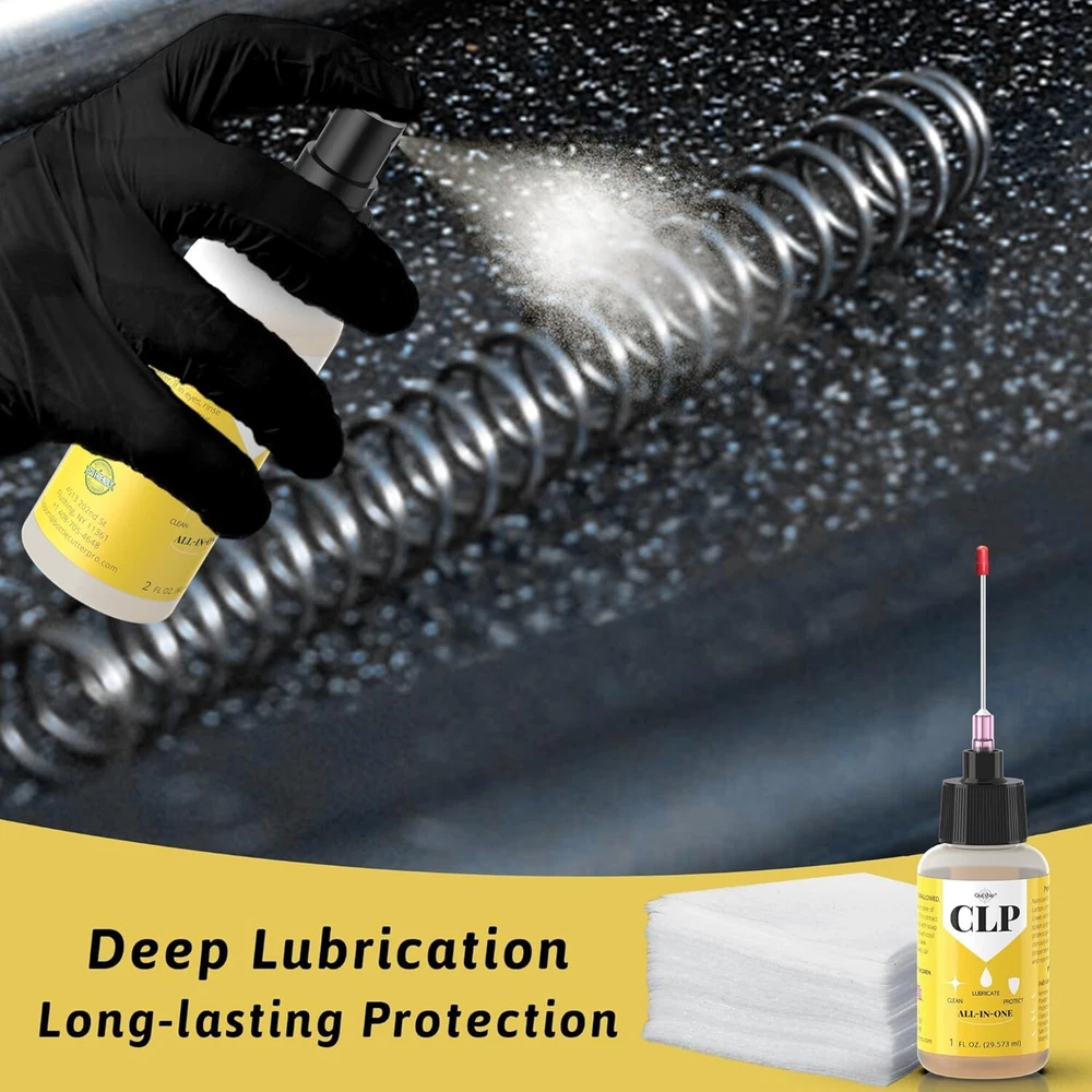 PREMIUM FORMULA GUN OIL; The gun oil with ingenious formulation, not only lubricates, cleans and provides a long-lasting protective coating for your gun, but also reduces component friction and metal wear, so you can fully protect your gun with only CLP. EFFECTIVE CLEANING; Our clp gun cleaner and lubricant has passed repeated tests, not only effective for all components, internal and exterior parts, also clean gunk, grime and burnt powder residue. After gun cleaning generates long-lasting protective coating helps avoid malfunctions of moving parts caused by fouling build-up. EASY TO USE; The gun cleaning kit include 1 x 2oz pump sprayer gun lubricant, 1 x 1oz needle oiler gun lubricant, 20 x 3" square cleaning patches. It easy to clean hard-to-reach areas, so don't worry about small gaps inside your weapon. In addition, you can also remove rust on knives, drills, weeding machines and other metal items. WIDE TEMPERATURE RANGE; Gun cleaning kit with oil and cleaner ensure that your gun will not freeze and still run, though in temperatures as low as minus 65 degrees and as high as 400 degrees. Make sure your gun performs at its best in any environment. OUR SERVICE: We value our products and customer experience. If you are not satisfied with what you receive, let us know. We are committed to meeting the needs of users and continuously improving our products. Product Description Qucship is premium formula since 1899. The 2 oz pump sprayer attachment delivers a fine mist spray, 1 oz portable needle oiler allows you to easily squeeze out gun oil. At the same time, 1 oz portable needle oiler the light and small size allows you to carry it with you, and you can maintain your favorite gun anytime, anywhere! Ultra effective and potent solvent for clean gunk, grime and burnt powder residue, and helps avoid malfunctions of moving parts caused by fouling build-up. The premium formulation can lubricates your gun, generates long-lasting protective coating, reduces component friction and metal wear. Rated for temperatures as low as -65°F and as high as 400°F, make sure your gun performs at its best in any environment. Qucship has become the go-to product for many hunters and continues to be the preferred product for special forces units all over the world. Qucship brand gun oil, odorless, suitable for all firearms! Just one step, for quick penetration, deep lubrication, removal of dust and rust, and long-lasting protection, to maximize the protection of the performance of the gun. In addition, our gun oil can also remove rust on knives, drills, weeding machines and other metal items. To achieve the effect of a variety of uses.
