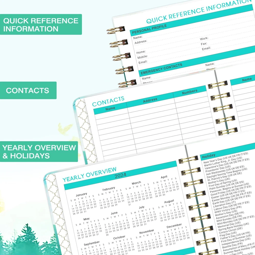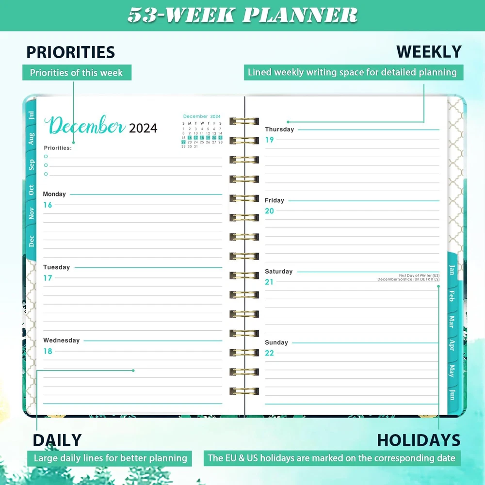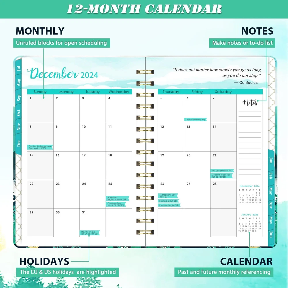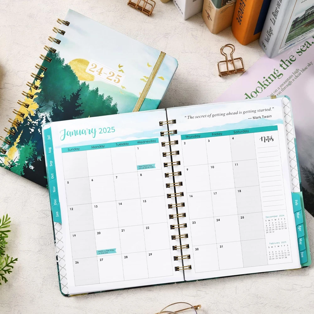 π 2024-2025 Planner Overview - The planner 2024-2025 date from JULY 2024 to JUNE 2025, measured 8.5''x 6.4'', featuring 12 months of weekly and monthly pages, it's convenient to take in a school bag or handbag, suitable for note-taking for your next school year. π Monthly Planning Pages - Each monthly pages of this 2024-2025 planner contains an overview of the month and a notes section. There are unruled daily blocks in each monthly page for your monthly planning. Besides, marked major holidays remind you of each important date. the Notes Section can list your priorities of the month. π Weekly View Pages - The weekly view pages of this academic planner 2024-2025 contains ample lined space from Monday to Sunday for your to-do list. You can tick one item after you finish one thing. The weekly view pages can help you keep track of every day with a clear weekly view. π Content Pages Design - 12 months of monthly pages with past and future monthly referencing + 12 months of ample lined weekly pages with top priorities section + 2024-2026 calendar overview + 2024-2025 holiday pages + 2 contact pages. This 2024-2025 planner focus on meeting all your needs. π Functional Designs - | Inner Pocket | Elastic Closure | Flexible Hardcover | Strong Twin-Wire Binding | Planning Pages | Premium Thick Paper | Contacts | Quick Reference Information | Yearly Overview | Holidays.
