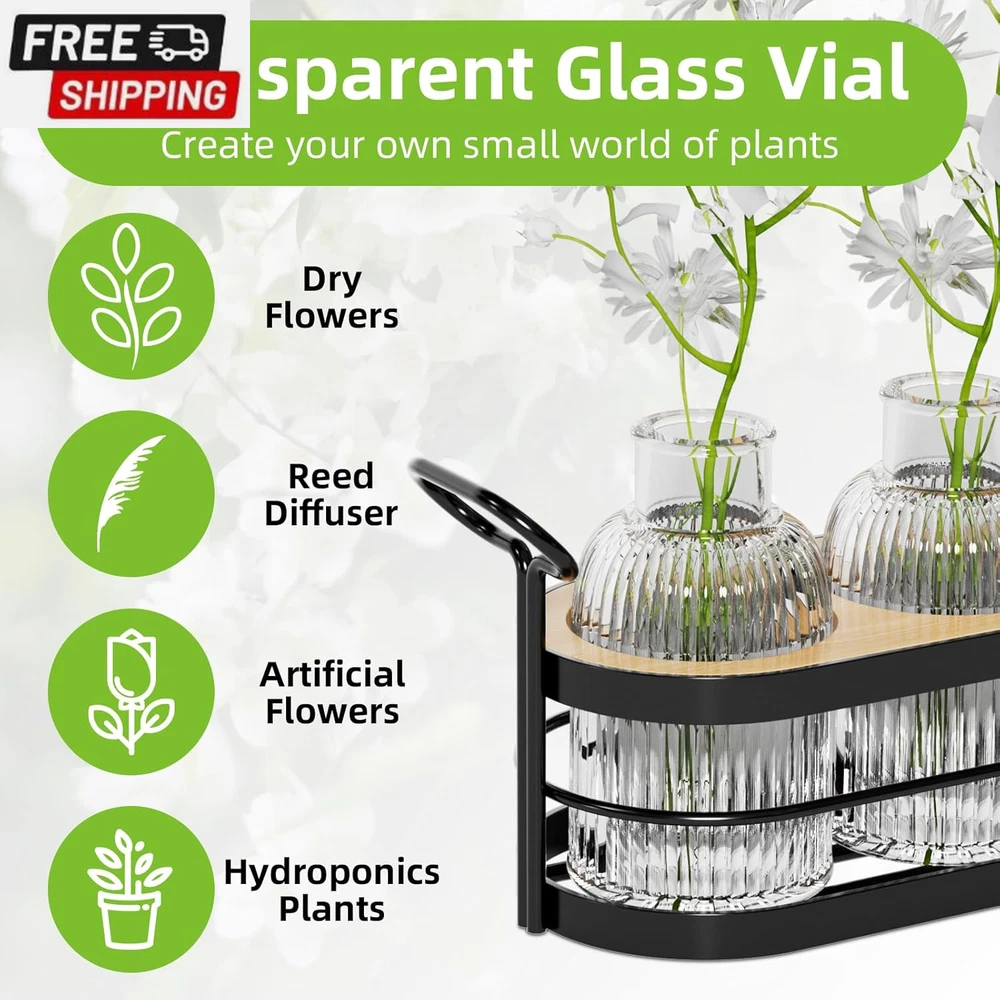 Plant Propagation Stations,Plant Terrarium for Propagating Hydroponic,Glass Planter Flower Vase for Hydroponic Plants,Home Kitchen Office Decor, Plant Lover Gifts for Women with Metal Stand 【BEST GIFT】This propagation stations can perfectly enhance the appearance of any table. You can give it to your own or send it as a gift on Anniversaries, Birthdays, Weddings, Housewarming, Thanksgiving, etc. They are lovely gift for friends or family. 【THICK &STURDY GLASS】These flower vases are made of thick and strong glass, which is durable and not easily broken. The patterned surface treatment makes them look very textured and makes them shine under the light. Feel the nature inside your home and make your home beautiful.If you receive a damaged vase, please contact us immediately, we will replace it with a new one or give you a refund. 【Plant Rooting Station】This minimalist and stylish planter terrarium works well for propagating house plant cuttings. no assembly required The propagation is already assembled and ready to use. 【DIY Plant Decoration】With its elegant and retro appearance, paired with plants and flowers you like,this hydroponic plant stand will be a chic addition to a small space. adding natural green and freshness to your life. 【Item Information】Package includes: a black metal stand , 5 glass bottles, a bamboo,a cleaning brush, note: plants are not included, the glass bottle is 100ML, the bottle mouth size is 0.8inch Product Description Shipping Fast shipping is very important for us. Our standard US shipping service is FREE. Your order will be shipped within 2-3 business days upon full payment received. Your order will be delivered within 2-3 business days after the handling time. We only ship to the confirmed PayPal address. We reserve the right to cancel any order for any reason at any time. We are not responsible for undeliverable addresses. Returns and payment We offer a 30 days return policy from checkout winning date. We allow only PayPal as payment method FeedBack Your feedback very important to us, after you get your package and you are satisfied with our service please leave us positive feedback If you have any problem with your order / any questions please before leave any type of feedback For any questions, using eBay contact system Please visit our eBay store to check out other items for sale! Thank you for shopping at our store.