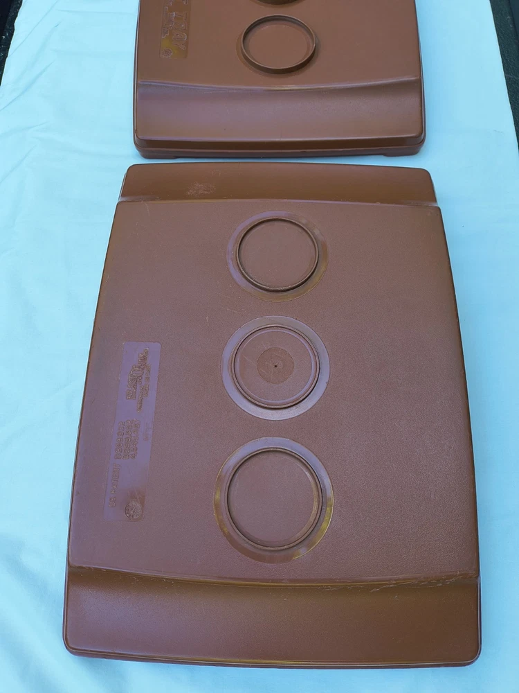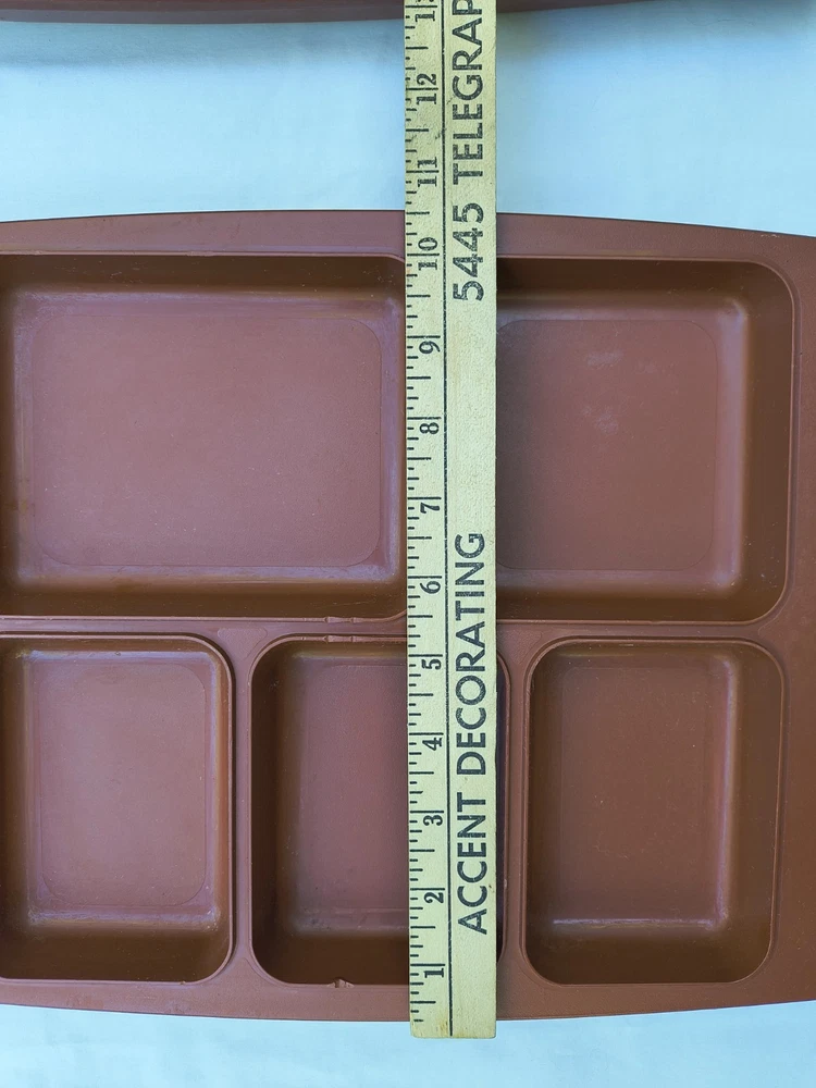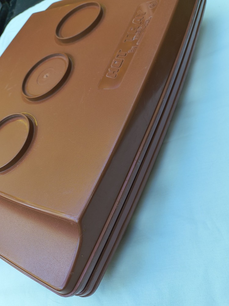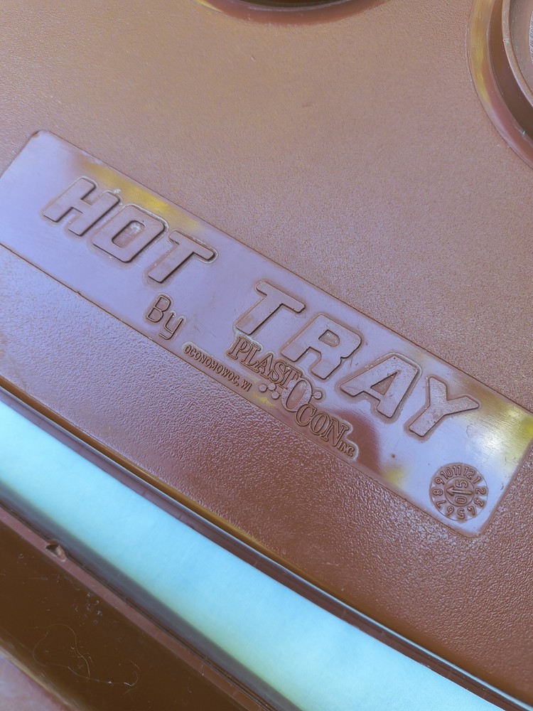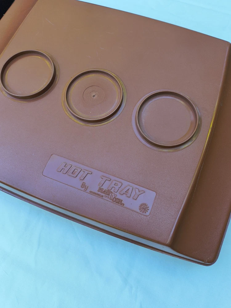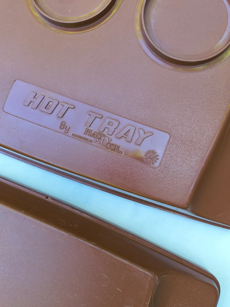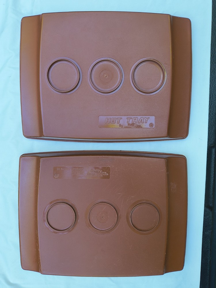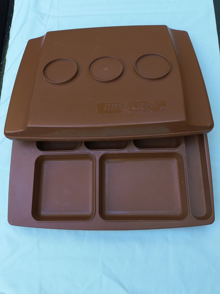 HOT TRAY Plastic Insulated 6 Compartment Food Serving Tray. The 2 trays can be used individually like cafeteria trays or one can be filled and the second placed upside down over the food to keep it warm and easy to transport. The raised edges around the food compartments of one tray fits inside the grooves of the other to prevent the tops from slipping off. These are stackable as well. These photos were taken outside and the yellow you see on the trays is a reflection of the leaves on the trees above. The trays are in very good condition but are pre-owned and vintage so there are some surface scratches but nothing excessive. Please see the photos for details. Thank you!