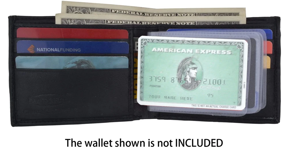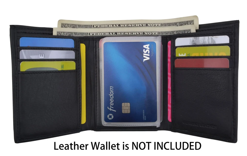 Features: Bifold Removable plastic Credit Card Holders insert for most bifold wallets with a back panel insert Trifold Removable plastic Credit Card Holders insert for most trifold wallets with a back panel insert Hipster Tall Wallet Removable plastic Credit Card Holders insert for for most tall wallets with a back panel insert Checkbook Removable plastic Credit Card Holders insert for for most checkbook wallets with a back panel insert Notes: wallets are not included. This listing is for the plastic inserts only.
