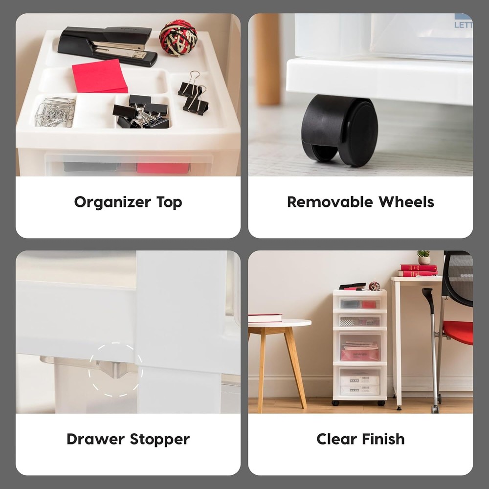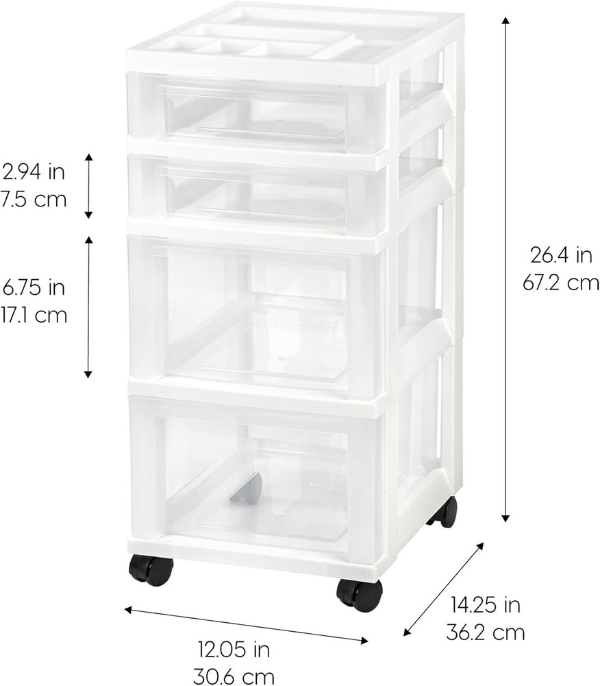 MULTI-PURPOSE ORAGNIZER: Store a variety of household items that are frequently used in the office, closet, under-desk, kid’s room, craft room, nursery, or dorm room MOBILE STORAGE SOLUTION: Removable wheels are included, can be attached to the foot of the chest so you can move it around smoothly, or remove them for secured placement MADE IN USA: High-quality materials are used for our domestically-manufactured products. The sturdy plastic makes these durable, and the smooth glide drawers give you easy access to contents. We use recyclable material, so our products are green-circle certified. Drawers : Drawer stops are attached on both sides of drawers to prevent drawers from falling out. Drawer dimensions: 12.5”D X 9.5”W X 2.94”H (Shallow) / 6.75”H (Deep). DIMENSION: 14.25"D X 12.05"W X 25.94"H Product information Color White Material Plastic Frame Material Plastic Product Dimensions 14.25"D x 12.05"W x 26.4"H Number of Drawers 4 Item Weight 6.4 Pounds Assembly Required No UPC 762016490496 Global Trade Identification Number 00762016490496 Item Weight 6.44 pounds