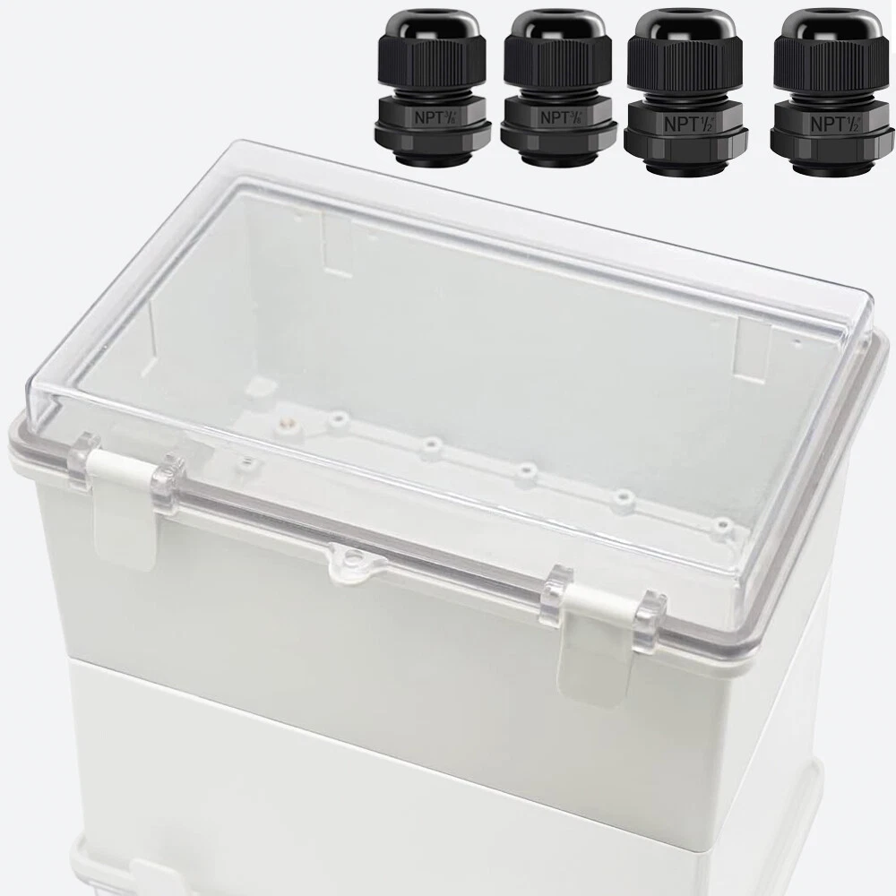 About this item: 【Specifications】Product name: Electrical Box; Waterproof rating : IP65; Qualification:CE、ROHS; Material: ABS, PC; Main Color: Gray 【Industrial Electrical Box】: electrical unit is not only weather resistant but also waterproof and does not allow dust to enter. You can drill holes inside depending upon your project requirement with no cracks and compromise 【Easy to operate】: electrical unit is easy to install, Hinged enclosure makes the opening and closing easier; Come with gr ey transparent cover,the inner project of junction box can be more visible 【Comprehensive Industrial Enclosure】: The junction box features two or three plastic latches for added security and locking. Moisture proof, sunscreen, anti-corrosion for safety from weather based environmental hazards Size: 11.42" x 7.48" x 5.51" Package Included: 1x Waterproof Junction Box 2x NPT 3/8 Cable Gland 2x NPT 1/2 Cable Gland