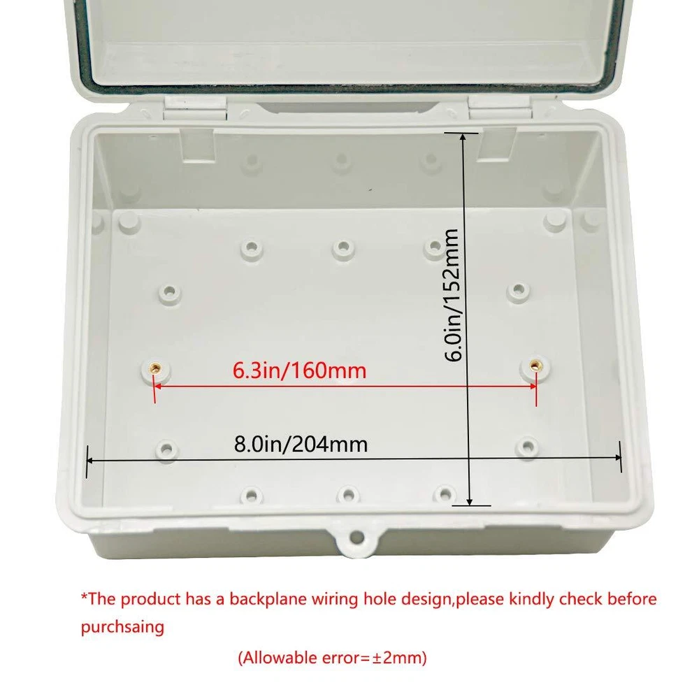 About this item: 【Specifications】Product name: Electrical Box; Waterproof rating : IP65; Qualification:CE、ROHS; Material: ABS, PC; Main Color: Gray 【Industrial Electrical Box】: electrical unit is not only weather resistant but also waterproof and does not allow dust to enter. You can drill holes inside depending upon your project requirement with no cracks and compromise 【Easy to operate】: electrical unit is easy to install, Hinged enclosure makes the opening and closing easier; Come with gr ey transparent cover,the inner project of junction box can be more visible 【Comprehensive Industrial Enclosure】: The junction box features two or three plastic latches for added security and locking. Moisture proof, sunscreen, anti-corrosion for safety from weather based environmental hazards Size: 8.7" x 6.7" x 4.3" Package Included: 1x Waterproof Junction Box 2x NPT 3/8 Cable Gland 2x NPT 1/2 Cable Gland
