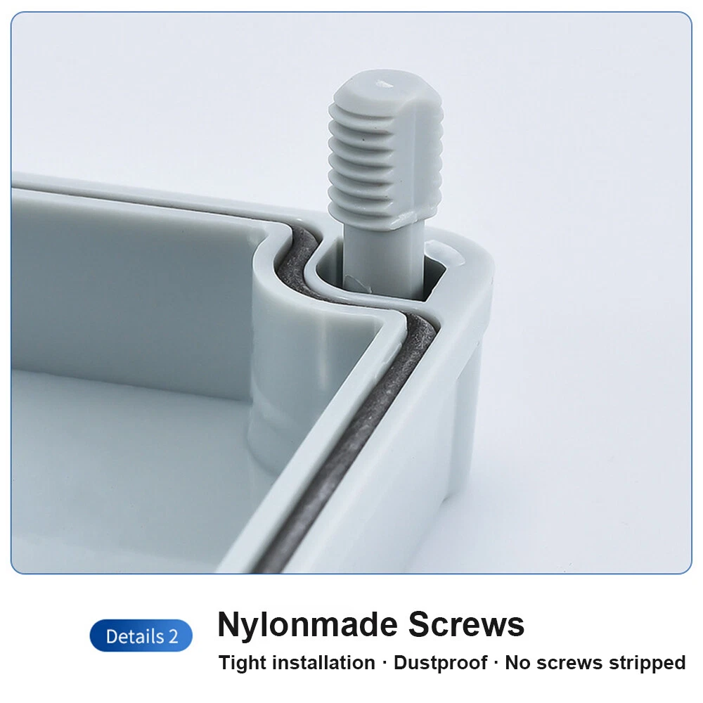 Features: [ Sturdy Construction ] Electrical Junction box is made of high-quality ABS plastic material, which offers excellent impact resistance and electrical insulation. Rest assured that your equipment will be well-protected in harsh environments. [ Safe and Certificated ] With CE RoHS compliant and IP67 waterproof rated, the electrical box is free of hazardous substances. The plastic box is predrilled which is easy to install and modify for your project. [ Nylon Screw ] Our electrical junction box comes with nylon screws, which is stainless and tightly installed. What's more , you don't worry about screws S t ri pp e d than t hose me t a l screws . [ Indoor and Outdoor Use ] With the feature of water resistance and dustproof,it can effectively block splashing water, rain, dust, snow, oil, UV and more. Whether you need to use it indoors or outdoors, this surface mounted project box is easy to operate. [ Extensive Application ] Our junction box is used in a variety of applications: residential homes wiring and connecting electrical devices, such as light fixtures, switches, and outlets; protect and connect electrical equipment for machines, motors etc. Specification: Waterproof Rating: IP67; Qualification:CE Material: ABS P l a s t i c ; Main Color: Gray S crew Thread Dia.: 0.4"/10mm Size: 175*125*75mm(6.9"x4.9"x3") Package included: 1x Waterproof ABS Electrical Junction Box