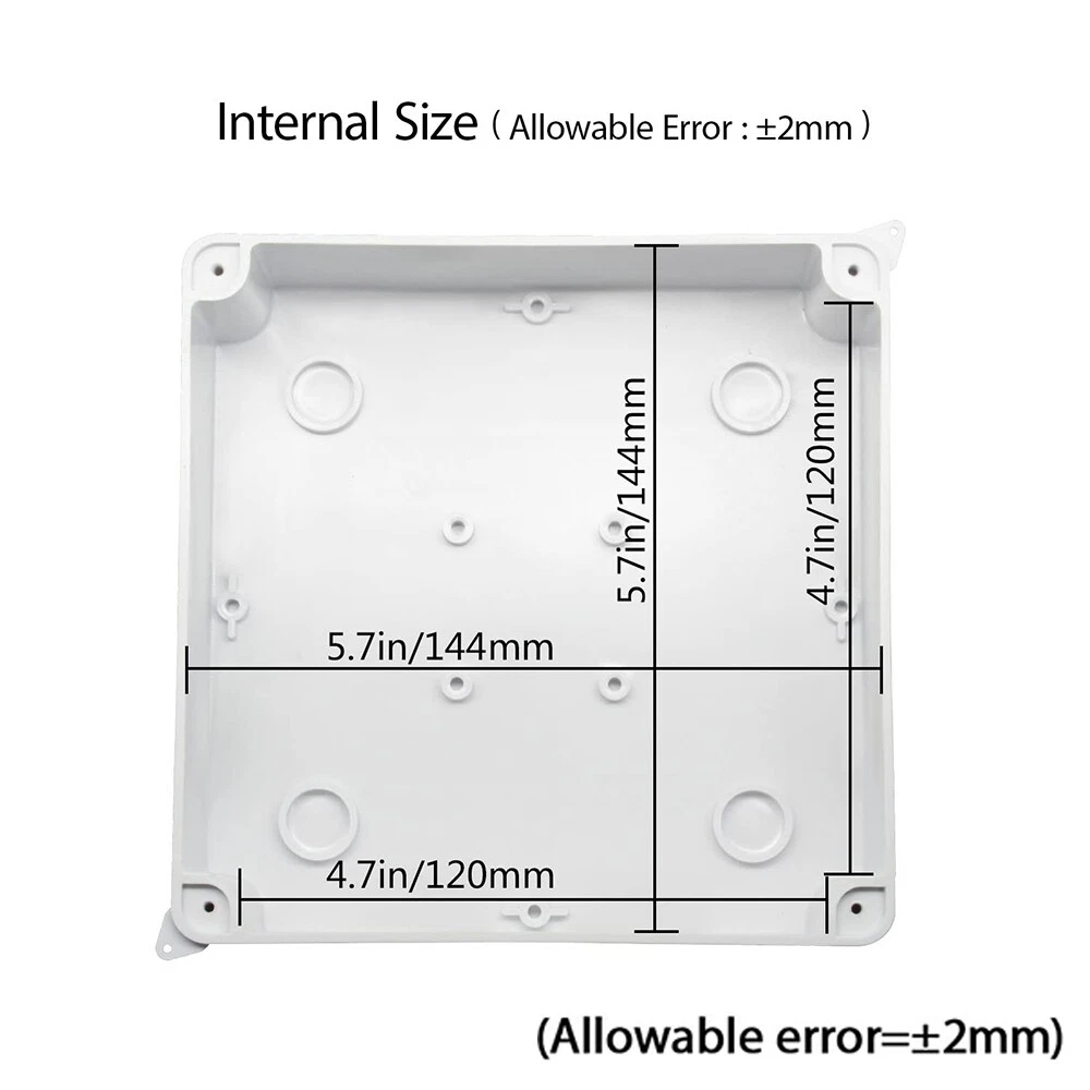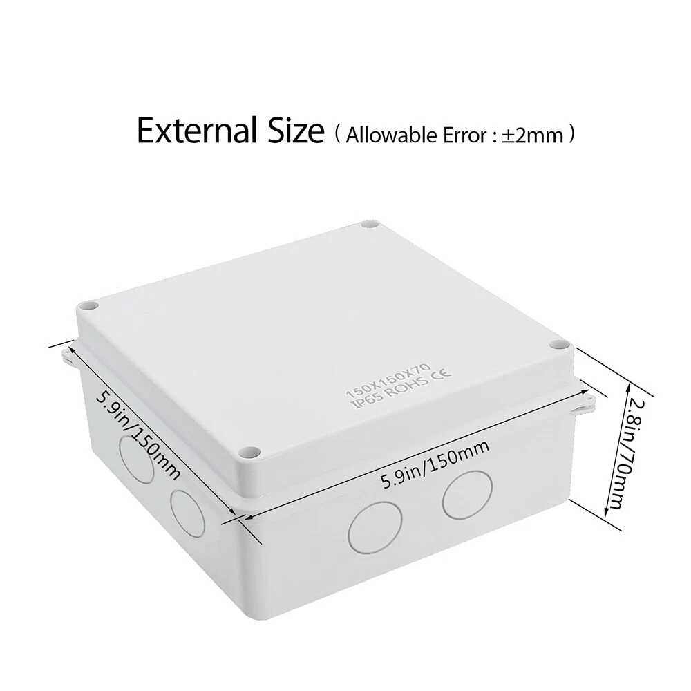 Features: Waterproof Material: ABS/Plastic Brand: Unbranded Mounting Style: Ceiling, Fixed, Modular, Panel, Surface, Suspended, Unit, Wall Resistance Properties: Child Resistant, Corrosion Resistant, Dustproof, Dust Resistant, Impact Resistant, Moisture Resistant, Rustproof, Rust Resistant, Scratch Resistant, Shockproof, Sunlight/UV Resistant, Tear Resistant, Waterproof, Water Resistant, Weatherproof, Weather Resistant Application: Automotive, Branch Circuit, Charging/Power, Commercial, Control Equipment Panels, Conveyance Lines, Cooker, Data Centers, Electrical Wiring, Electronics, Fan Control, Home/Garden, Home Appliance, Industrial, Instruments, Large Appliances, Light Control, Multi-Outlet/Power Splitter, Outlet, Portable Generator, Power Transformers, Small Appliances, Telecommunications, Transportation, Voltage Conversion Box Shape: Rectangular IP Rating: IP65 Type: Small Junction Box MPN: Does Not Apply UPC: Does Not Apply Color: White gtin13: Does Not Apply Protection Properties: Wire Protection Size: 5.9"x5.9"x2.75" Suitable For: Ceiling, Exterior, Interior, Wall Room: Any Room
