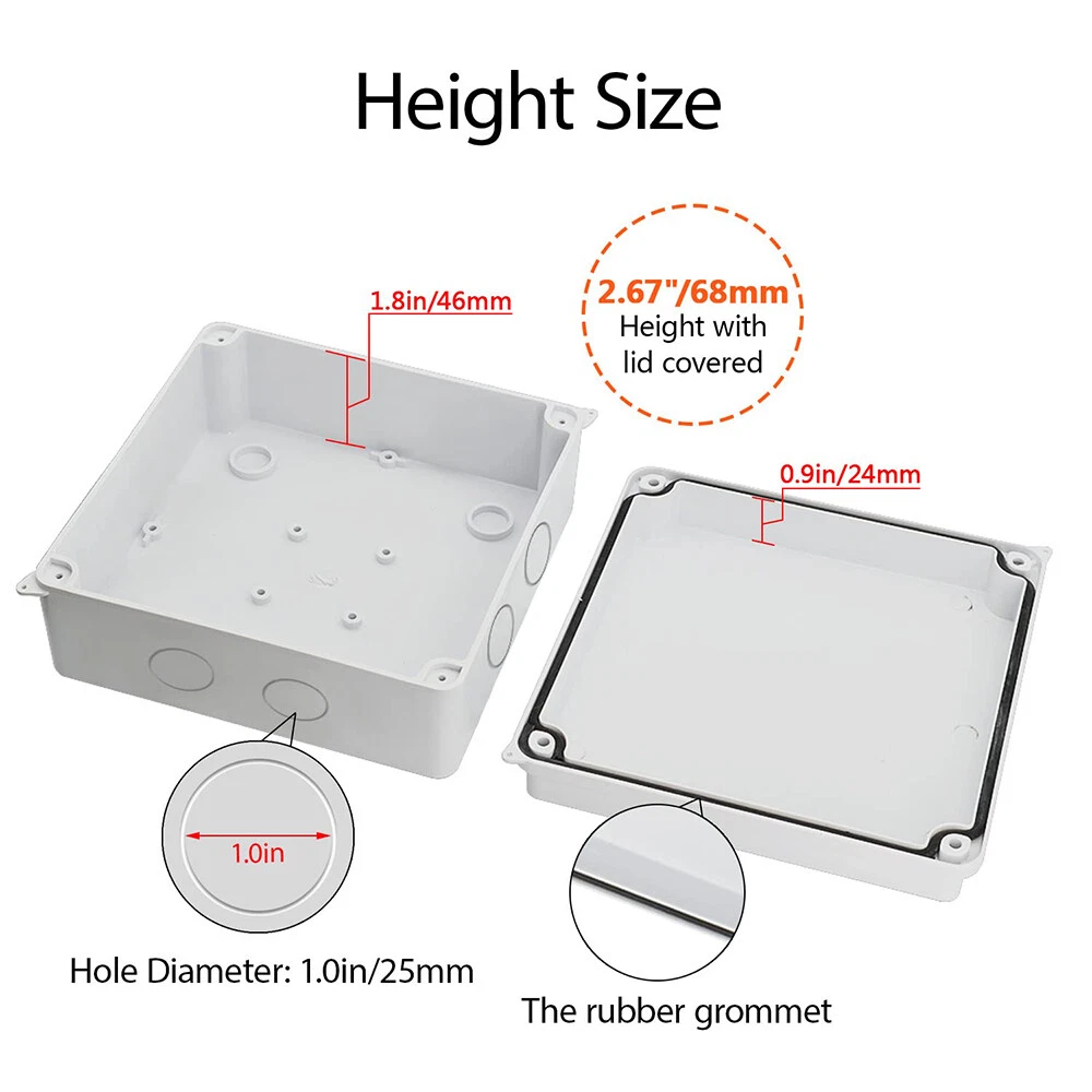 Features: [ Sturdy Construction ] Electrical Junction box is made of high-quality ABS plastic material, which offers excellent impact resistance and electrical insulation. Rest assured that your equipment will be well-protected in harsh environments. [ Safe and Certificated ] With CE RoHS compliant and waterproof rated, the electrical box is free of hazardous substances. The plastic box is predrilled which is easy to install and modify for your project. [ Indoor and Outdoor Use ] With the feature of water resistance and dustproof,it can effectively block splashing water, rain, dust, snow, oil, UV and more. Whether you need to use it indoors or outdoors, this surface mounted project box is easy to operate. [ Extensive Application ] Our junction box is used in a variety of applications: residential homes wiring and connecting electrical devices, such as light fixtures, switches, and outlets; protect and connect electrical equipment for machines, motors etc. Size: 5.9"x5.9"x2.75" Package Included: 1x Electrical Junction Box