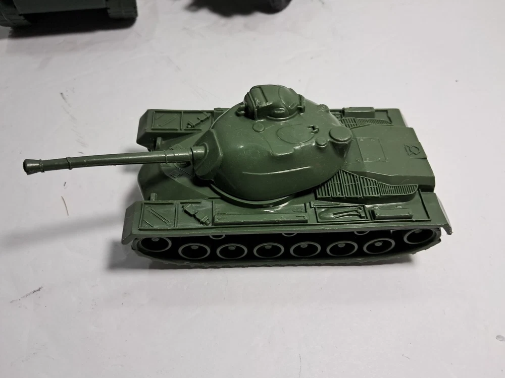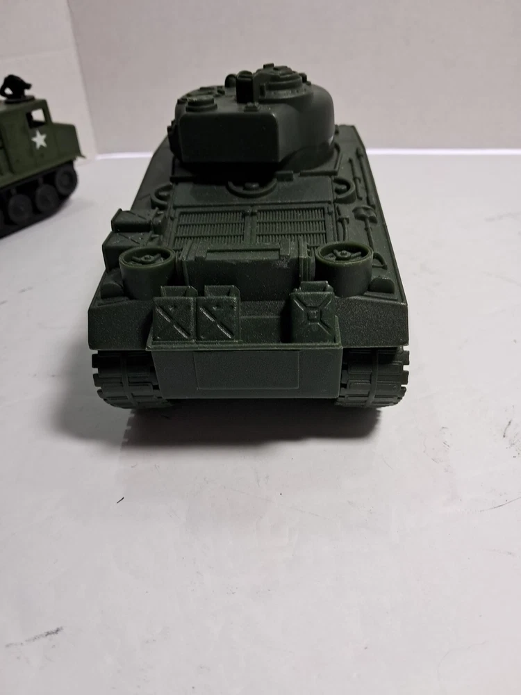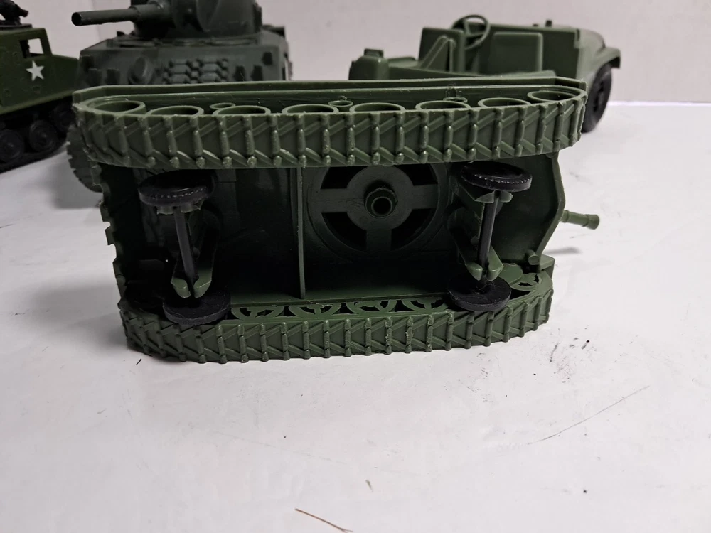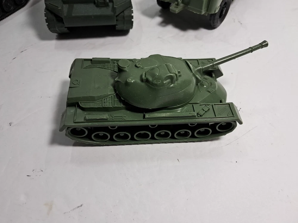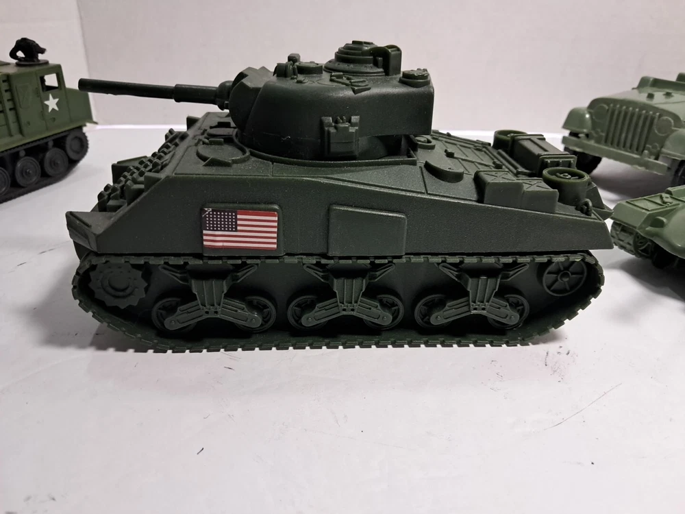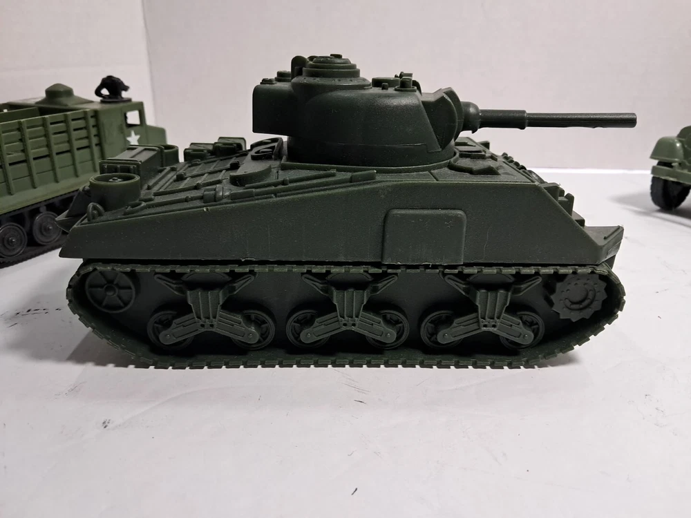 This lot of plastic military toys includes a variety of models and scales. Some of the items are older and rare, making them a great addition to any collector's collection. The toys come in assorted colors, with a green Sherman model being one of the highlights. These diecast and toy vehicles are perfect for enthusiasts of all ages who enjoy collecting and displaying unique items. The lot features a multi-scale selection of tanks and military vehicles, all made of durable plastic. Add this collection to your own or give it as a gift to a fellow collector.