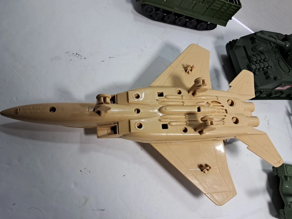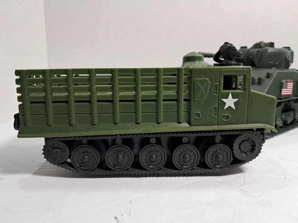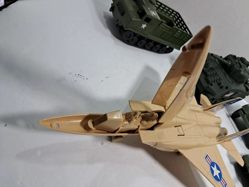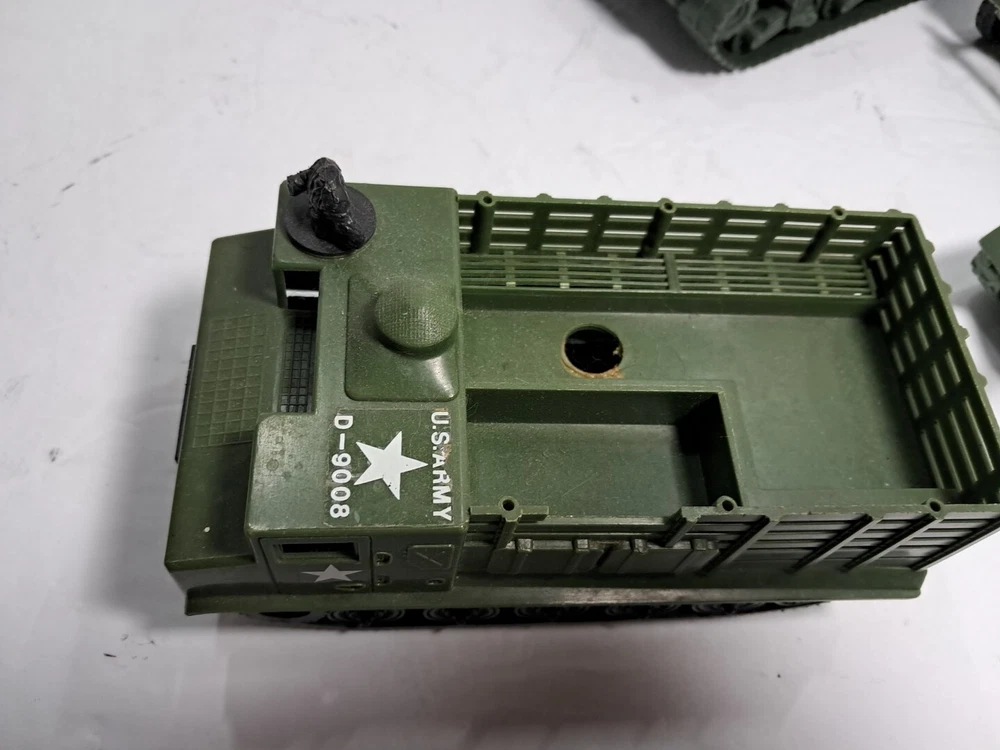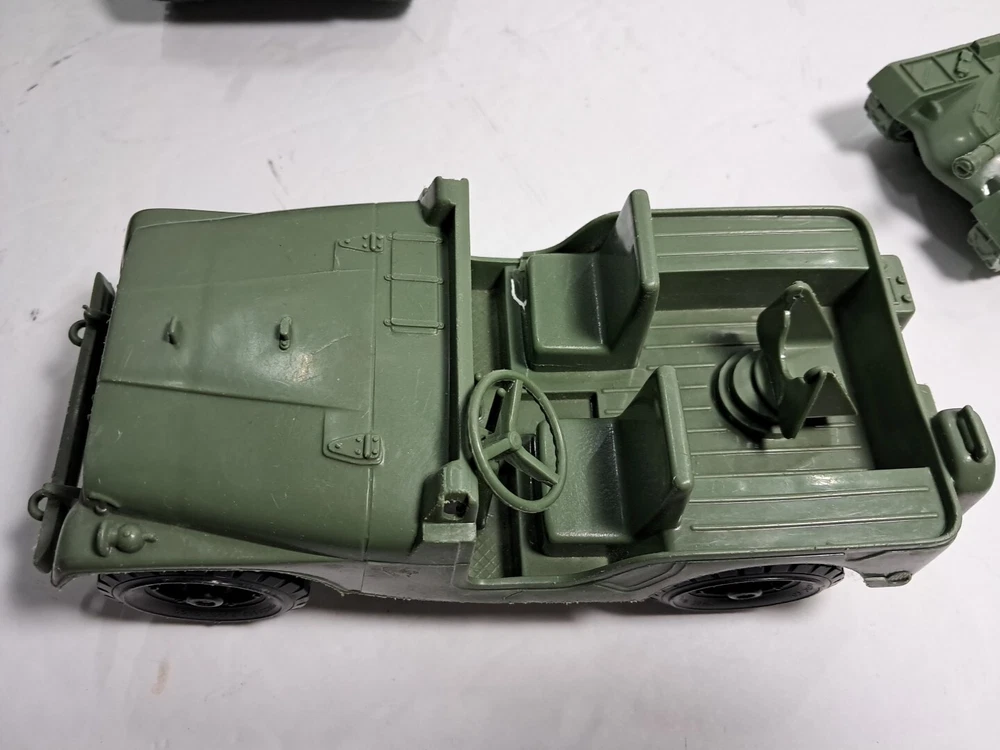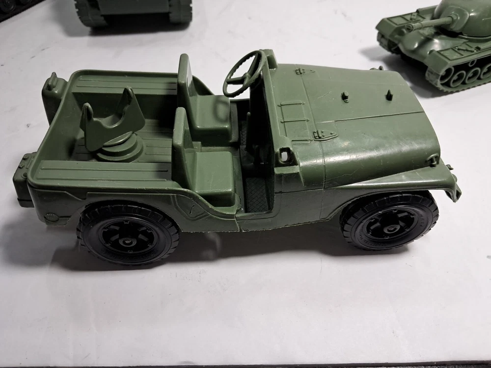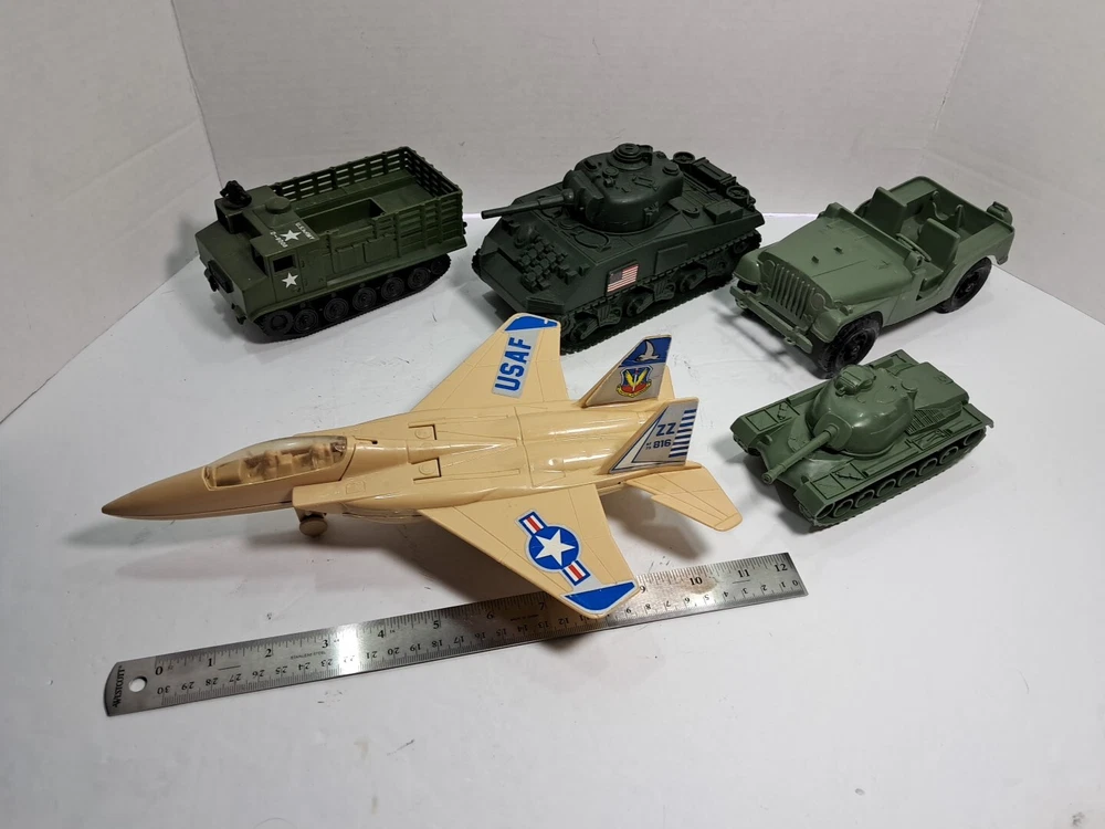 This lot of plastic military toys includes a variety of models and scales. Some of the items are older and rare, making them a great addition to any collector's collection. The toys come in assorted colors, with a green Sherman model being one of the highlights. These diecast and toy vehicles are perfect for enthusiasts of all ages who enjoy collecting and displaying unique items. The lot features a multi-scale selection of tanks and military vehicles, all made of durable plastic. Add this collection to your own or give it as a gift to a fellow collector.